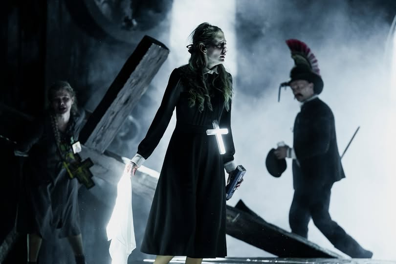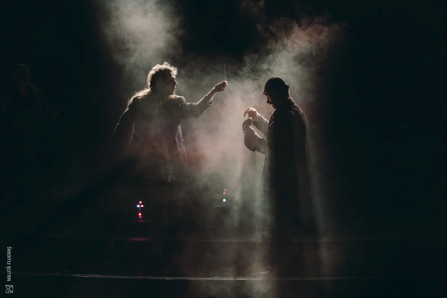 Cum altfel să privești la destinele anecdotice ale acestor personaje care reușesc și azi să facă umbră pământului cu ignoranțele lor uriașe, sperând la mântuire de la primul fals Mesia care le iese-n cale? Unelte religioase numai bune de folosit de autoproclamații lideri ai oricăror vremuri de răstriște care-și freacă mâinile în semn de mulțumire după ce s-au împreunat în pseudorugăciune pentru fiecare pasăre pe limba ei pierită?!… O femeie spurcată din care trebuie scos diavolul (Olga, fascinanta păcătoasă pe care Aylin Cadîr o electrizează și o ține în priză da capo al fine, alternând admirabil registrele și justificându-i cu vârf și îndesat metamorfozele pe drumul blestem-traumă-păcat-exorcizare-curățare/mister?, parcă dinadins neterminat, lăsându-i la îndemână tot magnetismul necesar spre a-l manipula pe Ilie pe care l-a prins în mreje încă înainte de cutremurătoarea scenă a exorcizării și care o ascultă cu încredere până la capăt). O femeie sfântă în care-și face loc diavolul (Wiera, mâna dreaptă a lui Ilie, ce-i îndeplinește ceremonios ritualurile și-i suportă supusă capriciile susținându-l și însoțindu-l cu credință, cea care parcurge traseul invers Olgăi, sfânta căzută în păcatul geloziei, invidiei și urii pe care Florentina Ţilea o aruncă de pe culmile evlaviei – umple scena cu prezența ei solidă și vocea distinctă cu care conduce mulțimea idolatră ce face să vibreze fiecare colțișor al Sălii Studio – direct în prăpastia celei mai adânci necredințe).
