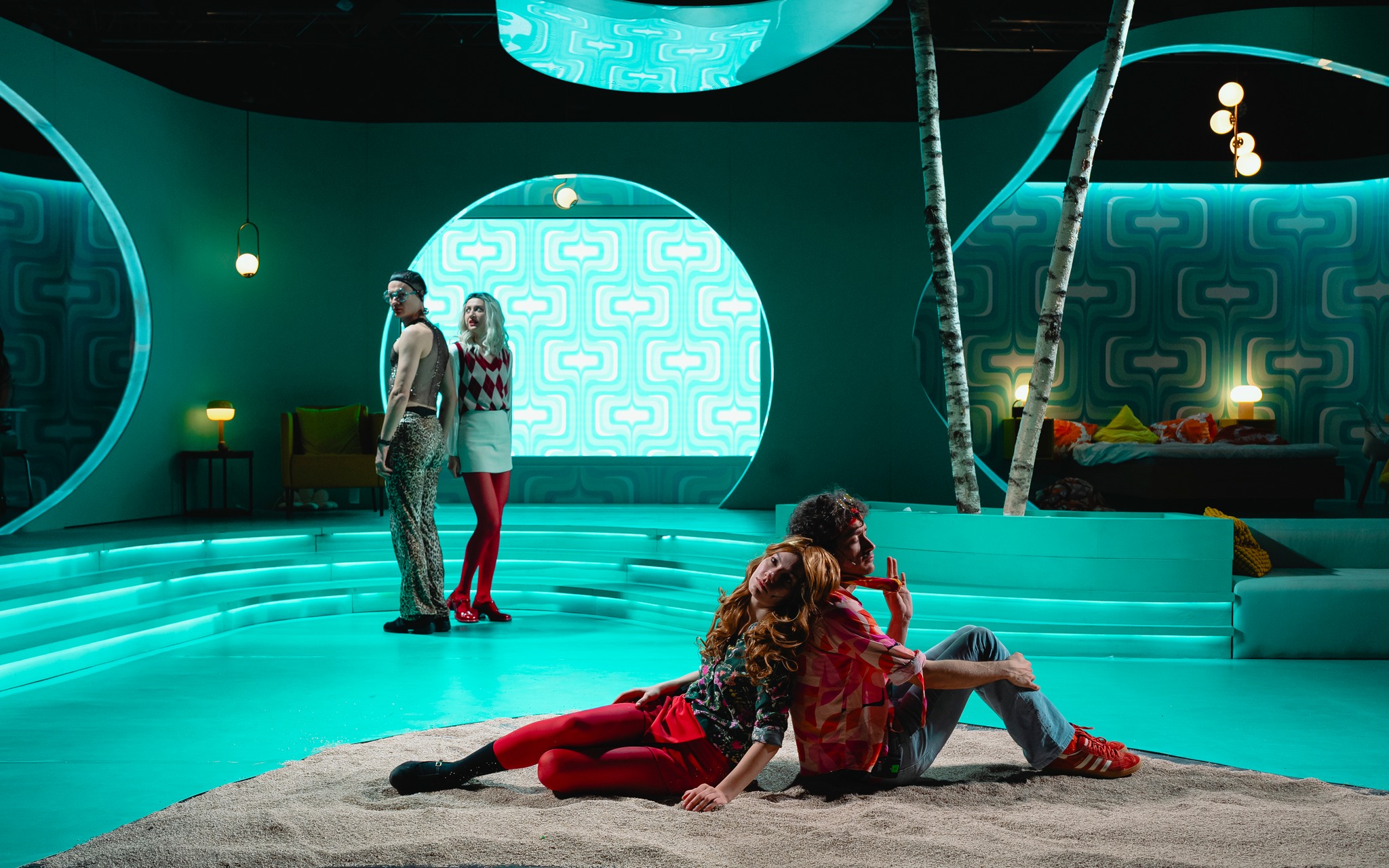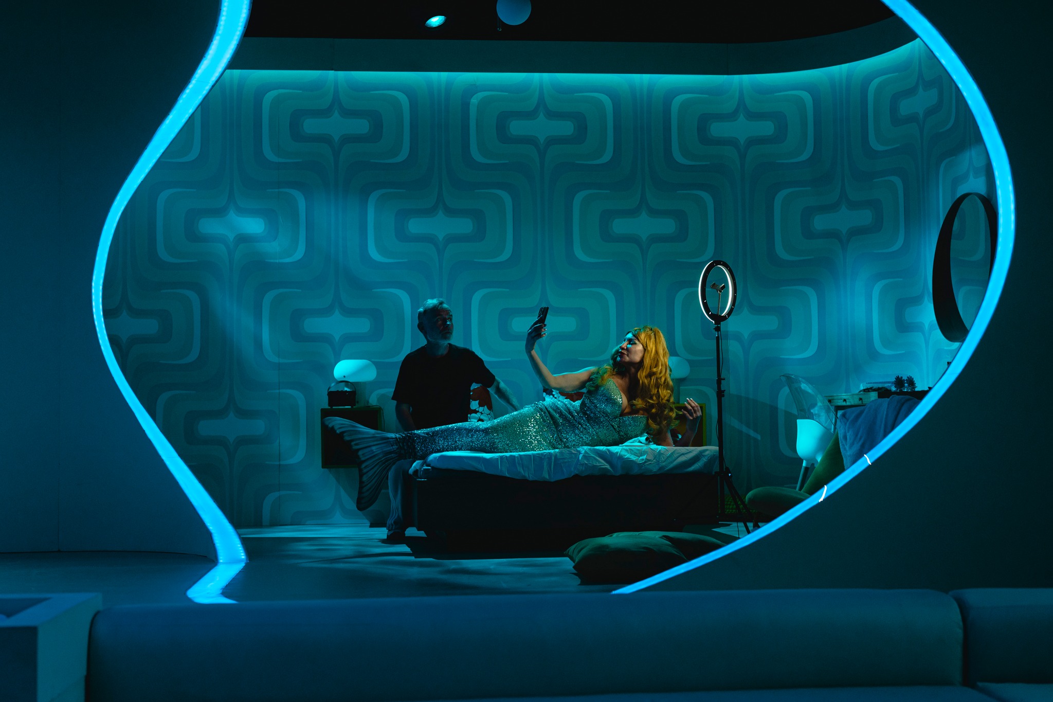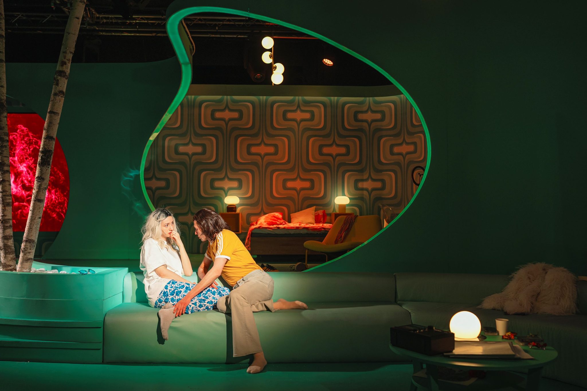 Am plecat de la Teatrul Lúcido sub Imperiul Kubrick, probabil una dintre ultimele referințe din spectacol, care mi-a activat instantaneu imagini colorate la care privisem fascinantă în urmă cu mulți ani. E vorba de un anume fel de imprimare pe retină a unor emoții pe care le trezește acest creator în mine de fiecare dată când spectacolele lui colorate (care au această componentă de retro-futuristic vizual, aici supra-dimensionată, dublată de obicei acustic) mă lovesc în plex. De fapt este o trimitere înapoi în timp, respectând întru totul normele cotidianului (pe care le studiază cu mare consecvență), reușind să facă trecutul inteligibil și fermecător și pentru generațiile de acum și pentru cele care au trăit în aceleași vremuri cu el, așa că tot ce se arăta teribilist, șugubăț și novator în tinerețea lui artistică acum devine suprainovator și plin. Nu întâmplător o are din nou alături pe scenografa Irina Moscu, un excelent artist vizual și poet al spațiului, care este în stare nu doar să transpună în minunate tablouri teatrale visele afrimiene și viziunile lui mai vechi și mai noi, ci să le ducă mai departe. Decorul ei urmărește linia celor câteva (foarte puține) scene din interiorul futuristic al scriitorului lui Stanley Kubrick din „Portocala mecanică” a anilor ’70 (mixate cu spațiul colorat al locuinței personajului principal), pe care însă le aduce într-un azi luminat și colorat, dedicat clătirii ochiului privitorului cu frumusețe și intrigă deopotrivă. Hublourile de formă neregulată din locativul ei fascinant propun un uriaș schweitzer vizual de sorginte kubrickiană, prin ale cărui găuri generoase poți privi cu încredere spre consistența brânzei care a stat multă vreme la fermentat ca să devină delicatesă, scotocind locativul și transformările lui în ultimele decenii (în fiecare dintre spațiile dedicate din această locuință de lux – dormitor, bucătărie, living). Dar le-a tradus în limbaj litoral estival, folosindu-se de marginile neregulate ale hublourilor ca de niște bule de apă ce se sparg uimite în turcoazul nebun din ochii unui submarin, scufundat în adâncurile celei mai liniștite mări ca să fie sigură de puterea intimității lor pentru teatralul afrimian.