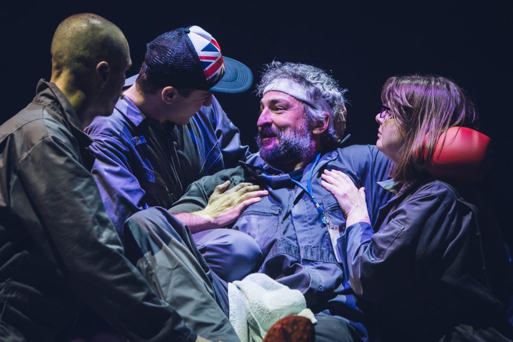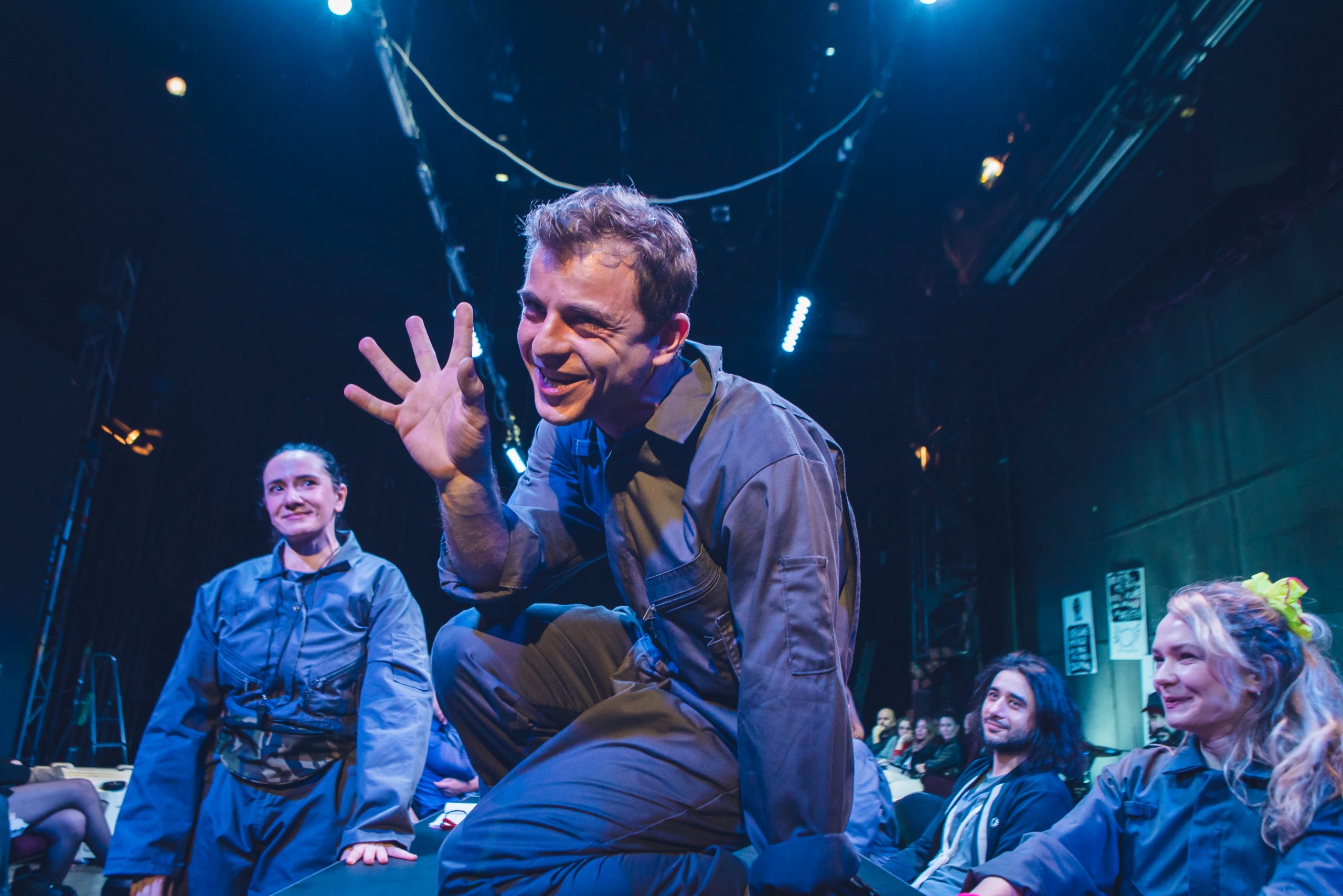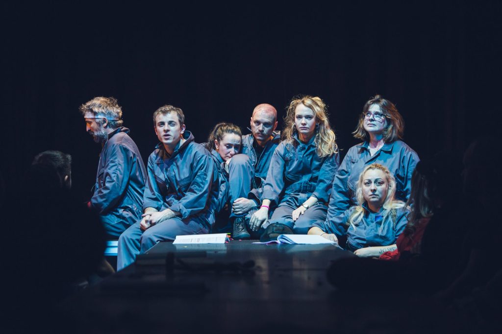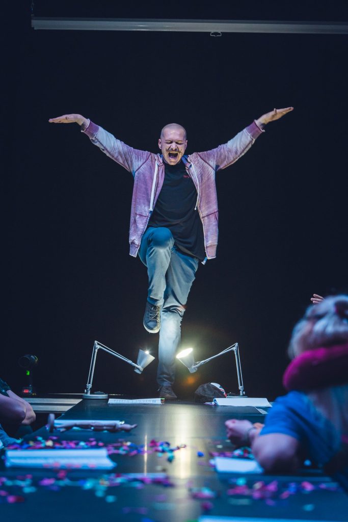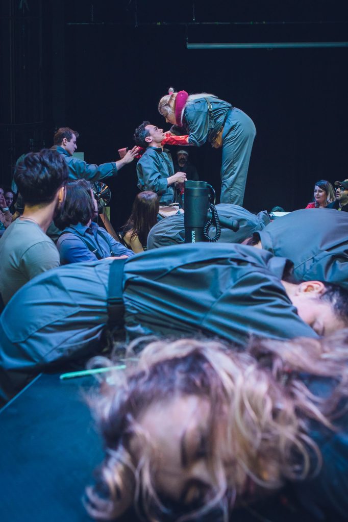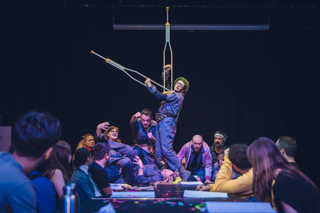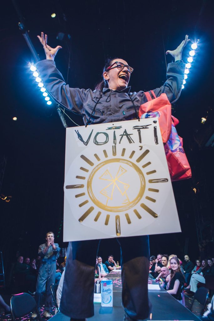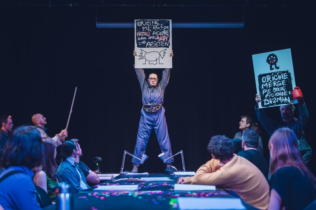 Orice asemănare cu ce s-a întâmplat în România după evenimentul fondator al secolului XX nu este deloc întâmplătoare, pentru că Andrei Huțuleac ia încă o dată de guler animalul proletar (sau bolșevic) propus de Orwell, îl îmbracă inspirat într-o salopetă-uniformă de lucru și-l așează (alături de spectatori) la masa de lectură a greșelilor istoriei pentru a-l face albie de porci (!), îl învață imnul și-i trage niște lozici fondatoare, apoi îl dotează cu panglici roșii (don’t worry, n-a uitat de contemporan, a strecurat și curcubeul!) și-l bagă în Cântarea României, ca să fie clar. Sub idolatrii de sezon, cu ode pentru popor și conducătorul iubit, dansuri și sporturi populare (mie mi-au trecut câteva Daciade prin fața ochilor!), ansambluri de explorare a cultului personalității (excelentă ideea puzzle-ului cu imaginea liderului), raportări de depășiri de plan și entuziasme controlate ale mulțimii capabile să realizeze cincinalu-n patru ani și jumătate, aparent tot mai fericită și tot mai datoare pentru această bunăstare, la adăpostul căreia suferința individuală începe să se manifeste în forme tot mai înspăimântătoare, cultivând frica și teroarea în rândul cetățenilor.