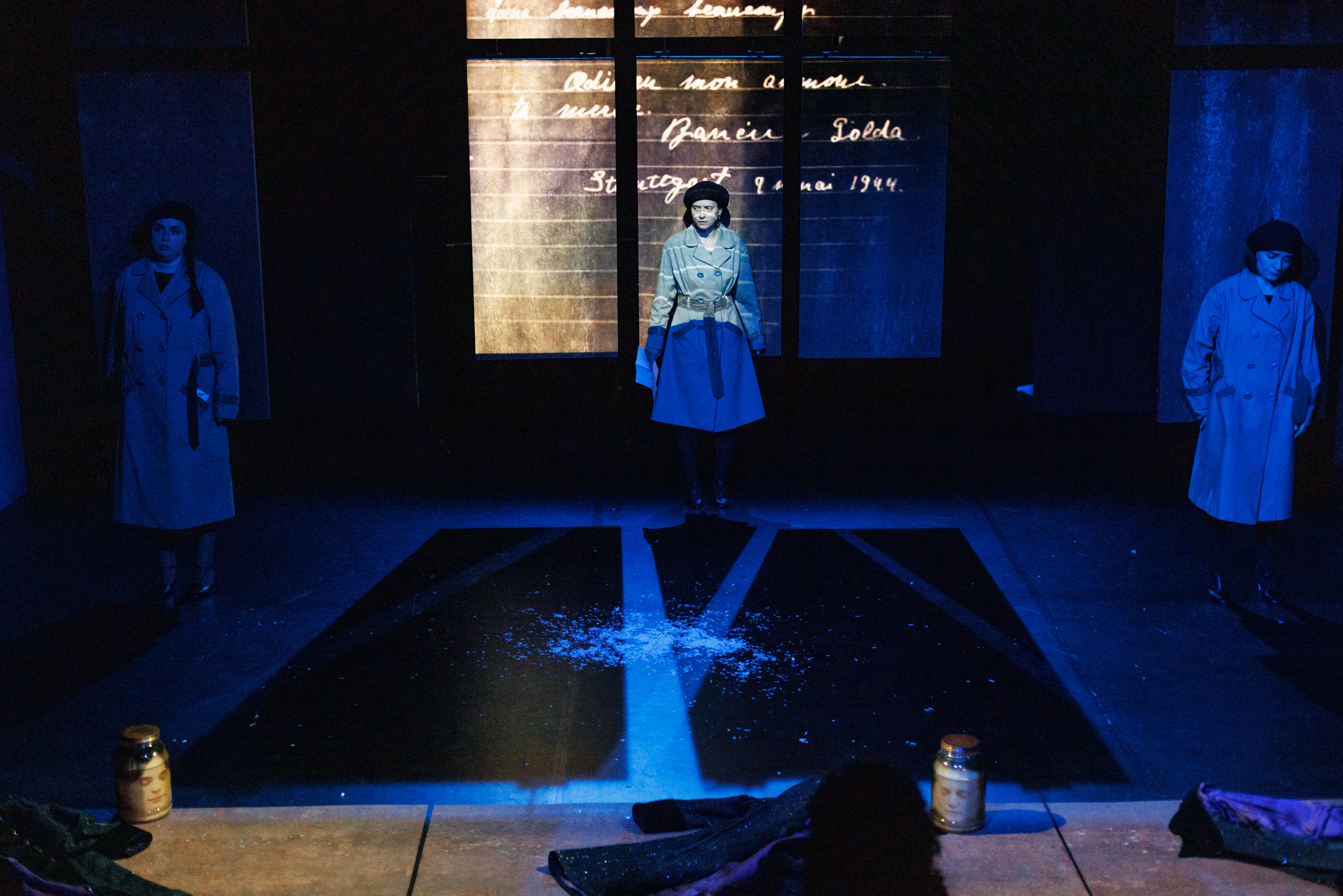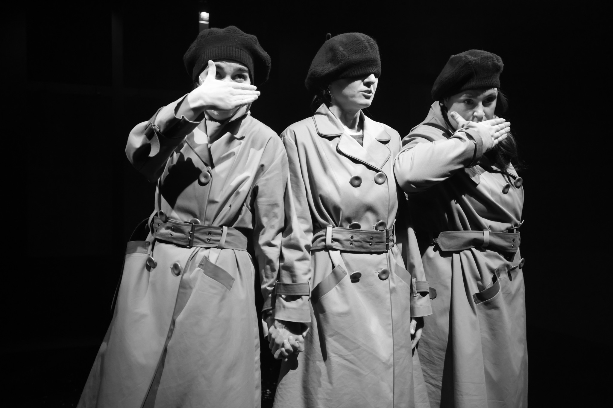 Pe trei voci care se joacă în fel și chip cu inocența și descoperirile personale, cu dezamăgirile, bullyingul, acceptarea și nesupunerea, cu provocările, avertismentele, amenințările, crezurile și proclamațiile, cu forțele care au susținut-o ori care i-au fost împotrivă (toate trei reușesc excelente treceri în pielea unor personaje care i-au populat existența zbuciumată, cel mai adesea descurajând-o, acuzând-o sau abuzând-o – remarcabile ipostazele familiale și cele din casa conspirativă). Dar și trei femei frumoase, puternice, senzuale și expresive care-și explorează și își folosesc năucitor farmecele feminine și măștile sub care trebuie să le ascundă pentru a se angaja în cele mai periculoase acțiuni de rezistență în întuneric și frig, printre frici, mitraliere, tancuri și bombe (impresionantă scena cu Olga în ipostază maternală, excelent susținută acustic de Silvana Negruțiu (!)).