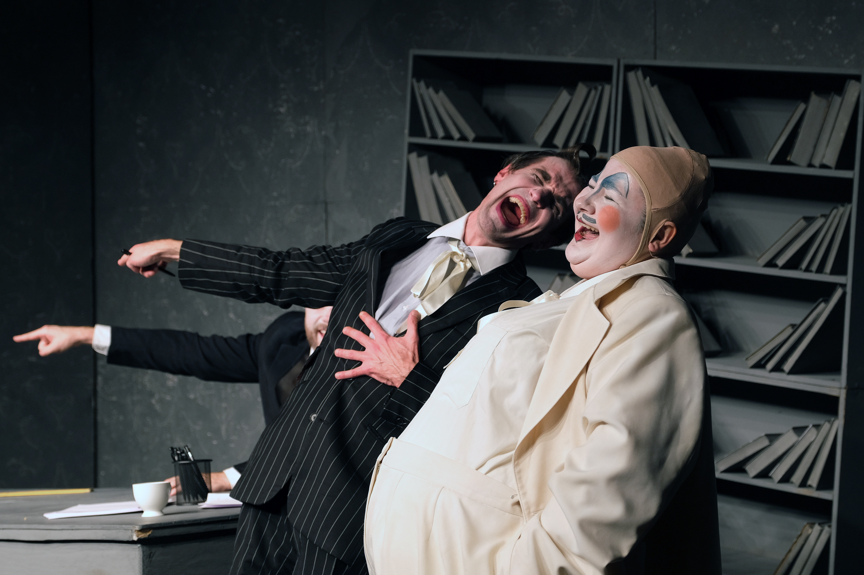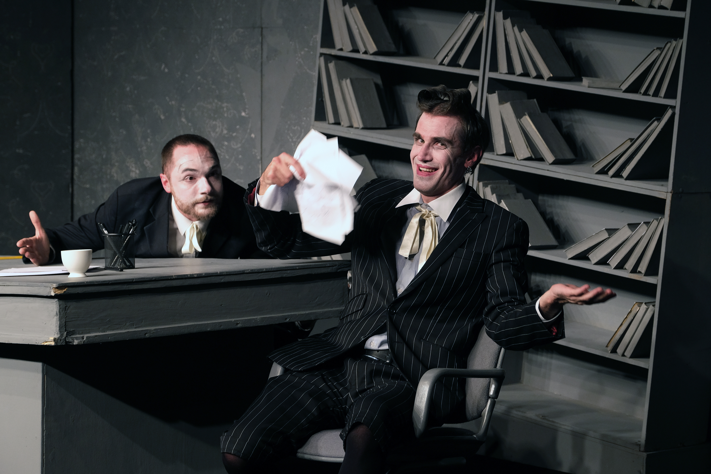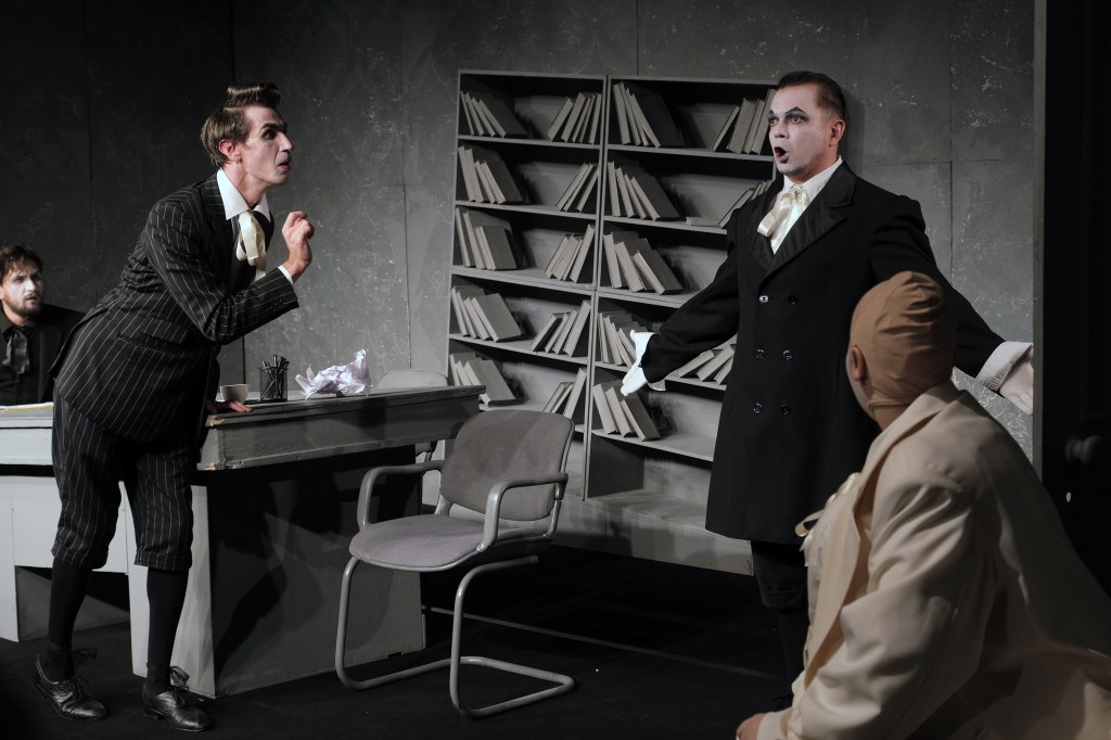 O minunată convenție estetică a nonconvenționalului jovial (încă dinainte de începerea spectacolului), excelent susținută pe mai multe straturi, foarte precis suprapuse, într-o privire ludică intensă, inteligentă și caustică asupra disfuncționalului din societate, suprasaturat de redundantul din comunicarea și acțiunile fără sens în care-și leagă cotidianul unul de altul acești eroi ai banalității dintr-o ierarhie mutual acceptată. Cu toții nobili ai ilogicului și nonsensului, intersectați dinadins într-un birou de lucru la Absurdul existenței, prezentați întru ofrandă pe altarul istoriei care nu-i mai suportă (ba poate chiar s-a plictisit să se tot repete), dar îi mai îngăduie puțin, măcar cât să aruncăm și noi o ultimă privire înainte de colaps. Ca într-o vitrină în care această lume aflată în prăbușire (excelentă geometria spațiului unde totul se străduiește să alunece și să fugă din scenă din doar câteva linii simple care le forțează vizual orizontalele și gravitația (!)) este scuturată temeinic, la vedere (frumoasă cuprinderea cu mâinile), de Creator. După ce a fixat-o mai întâi pertinent în alb și negru, sub semnul unei nobile eleganțe stilistice (care asigură unitate în esențe la nivel de decor, foarte bine prelungite în vestimentația și machiajele excelent executate, ce pun în valoare și fixează în memoria spectatorului fiecare personaj printr-o pată caracteristică de culoare (!)), aducând inteligent împreună epoci în care amestecă prețios arome dramatice, muzicale și vizuale într-un bal teatral nobiliar în cadru dramatic-office, cu toate exagerările la vedere.