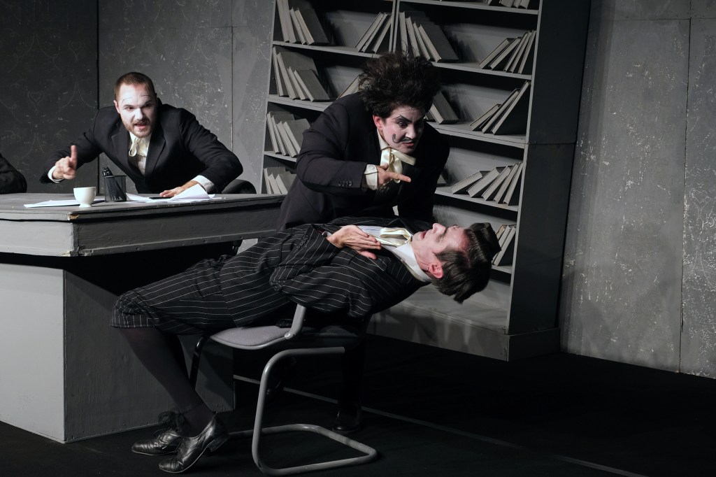 Iar Slava Sambriș nu s-a abținut câtuși de puțin să se folosească de calitățile fizice și motrice ale actorilor pentru a ridica scene uimitoare (în slow motion, pe repede înainte, ba chiar și pe repede înapoi (!)), jucându-se cu ritmuri și nuanțe ca un prestidigitator ce scoate mereu ceva din mânecă înainte să fi observat cineva că a fost băgat acolo, bucurându-se împreună cu noi de magia fiecărei descoperiri. Poate tocmai de aceea, zgomotul răspicat al replicilor absurde cade mereu în flux, ca o haină cu mâneci prea lungi și prea largi ce se străduiește întruna să-și găsească personajul potrivit în timp ce smulge zâmbete și ovații, spintecând cu coada toporului teatral arșicele din trunchiul deliciosului limbaj de lemn, îmbrăcat în absurdul după care ne ascundem cu toții.