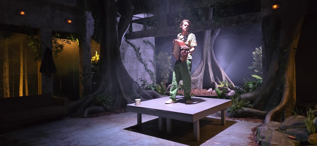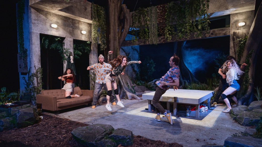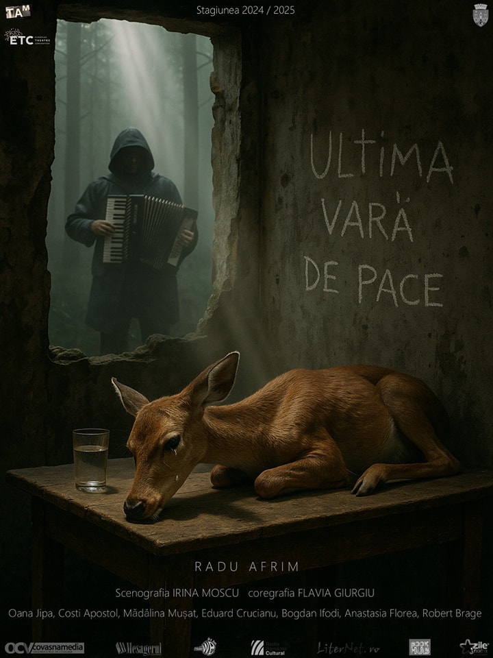 „Ultima vară de pace”. O cazemată frisonantă și fermecătoare pentru o bogată și fascinantă pădure dramatică, ridicată de Radu Afrim în jungla necruțătoare a lumii în care ne-a imaginat teatral contemporanul alături de Irina Moscu, între melancolii, ciripituri de paseri neliniștite, ciuperci, stropi de ploaie și căprioare curioase ce ne dau târcoale printre obiecte vechi și pachete cu alimente aduse de acasă întru tovărășie de un grup de prieteni vechi care par să-și fi făcut deceniile pe aici, adunați la un ultim picnic postelectoral. Străjuit de trunchiuri bătrâne, ferigi uscate și mult beton armat, străpuns neașteptat de rădăcini viguroase, poate ale unui bun simț de la mama natură pe care l-am recuperat, la mustață, cine știe pentru cât timp, spre a mai rămâne (măcar un mandat) la adăpost de urgiile vremurilor. O cazemată care ne primește generoasă în cețurile și misterele naturii noastre cele mai intime, cu labirinturile la vedere, străbătute melancolic de valurile și ecourile cântecului unui lopătar dintr-un vals celebru, împinse discret din burduful acordeonului de năluca celor mai importante frisoane ce ne-au traversat recent șira spinării, întrupată în chip trist și blond în mijlocul scenei.