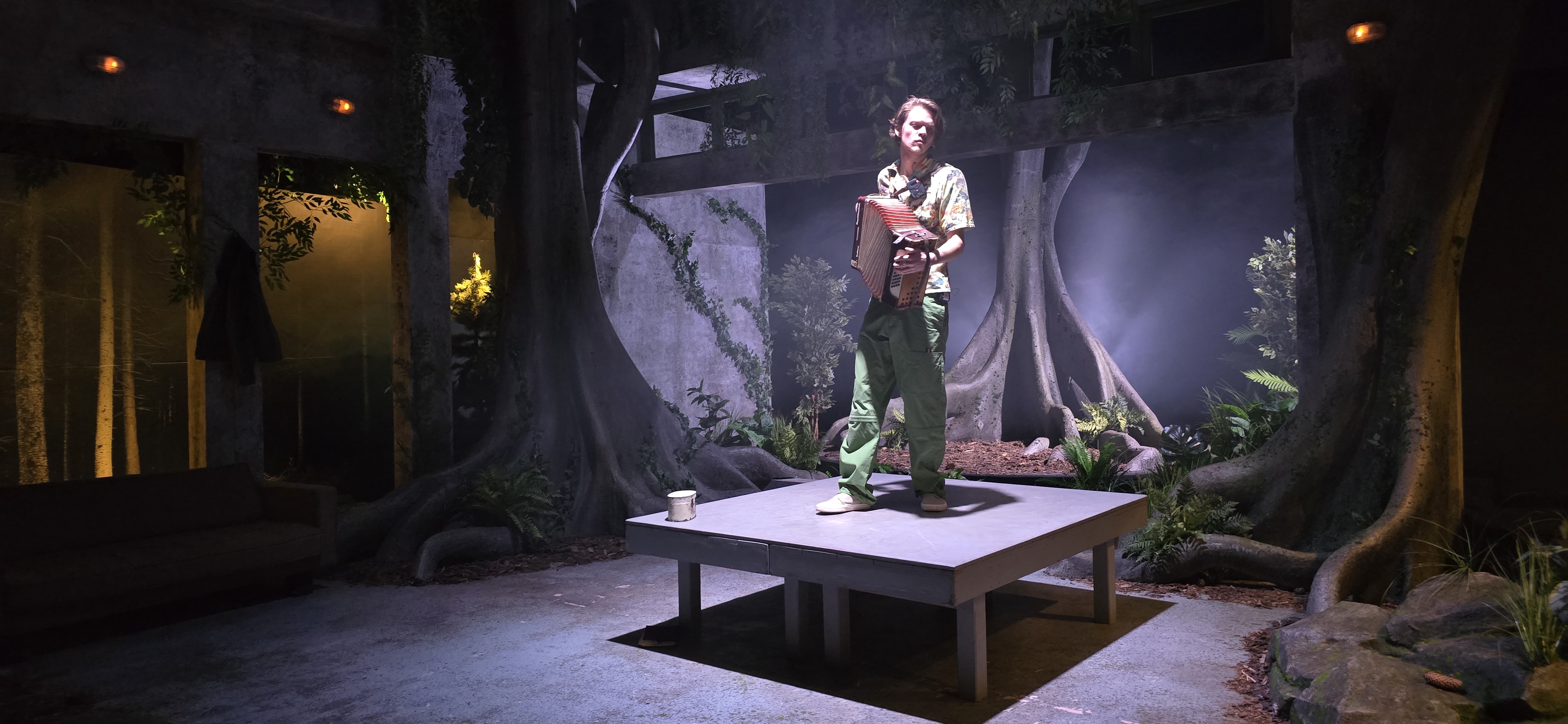 Dintre ei se remarcă fără doar și poate cel mai orfan dintre orfani, numitul Lucică. Nu cred că prestația lui Costi Apostol are să scape nepremiată în această stagiune. Personajul lui e un monument al vulnerabilității și chintesența rezistenței delicate impuse acestui grup în degringoladă (și a noastră, a tuturor celor rămași cu gura căscată într-o dimineață de noiembrie care ne-a scuipat nemestecat pe masă, în urma votului, un personaj cvasinecunoscut de sorginte ideatică rusească, fără șansă electorală, crescut mare la umbra chinejilor de pe tik-tok care și-au mișcat disciplinat armatele de boți). Lucică, un sfânt printre sfinți (!) cu gestică alarmistică delicioasă și pacea interioară vraiște, ciuruit de gloanțele singurătății și geloziei, care ne invită să salvăm ce-a mai rămas de salvat în noi. Sculptat în granitul unor precizii de interpretare atent ghidate (este excelent scrisă partitura lui, cred că cea mai puternică dintre toate, poate tocmai că personajul atinge în construcția lui apogeul fragilității, liric și dramatic) către un întreg fascinant, energic și ludic, plin de nuanțe lacrimogene și intransigențe surprinzătoare atât la nivel de rostire, cât și la nivel de gestică și mișcare. Dacă arderile, inconsecvențele, speranțele, îndoielile, labilul, în general tumultul din sufletele și mințile tuturor ar putea fi materializate într-un singur portret în carne și oase, el ar primi definitiv chipul și numele lui Costi Apostol. Un actor candid-efervescent, care ne poartă cu duioșie, ironie și sarcasm nu doar prin cele mai triste dimensiuni ale unui personaj condamnat la speranță, ci și la supraviețuirea printre alte povești triste de viață în lipsa unui alt scut împotriva războiului ce stă să-și detoneze bomba în grupul speriat de prieteni care tremură în pădure. Cu sabia extremismului atingându-i amenințător beregata, pe care nu o ferește însă de alte tăișuri de sezon (bulllying, respingere, trădare, excludere, inclusiv agresiuni prin autocompătimire și refulări diverse) cărora reușește să le facă față cu zâmbetul pe buze, jucându-se la nesfârșit cu șansele pe care universul i le oferă cu generozitate, inclusiv neexercitatul drept la vot (nu-i cazul, a glumit!) pe care îl poate purta mândru sub aureola de lumină de sub care oferă cuminecătura de chips-uri spicy credincioșilor din scenă și din sală (!).
