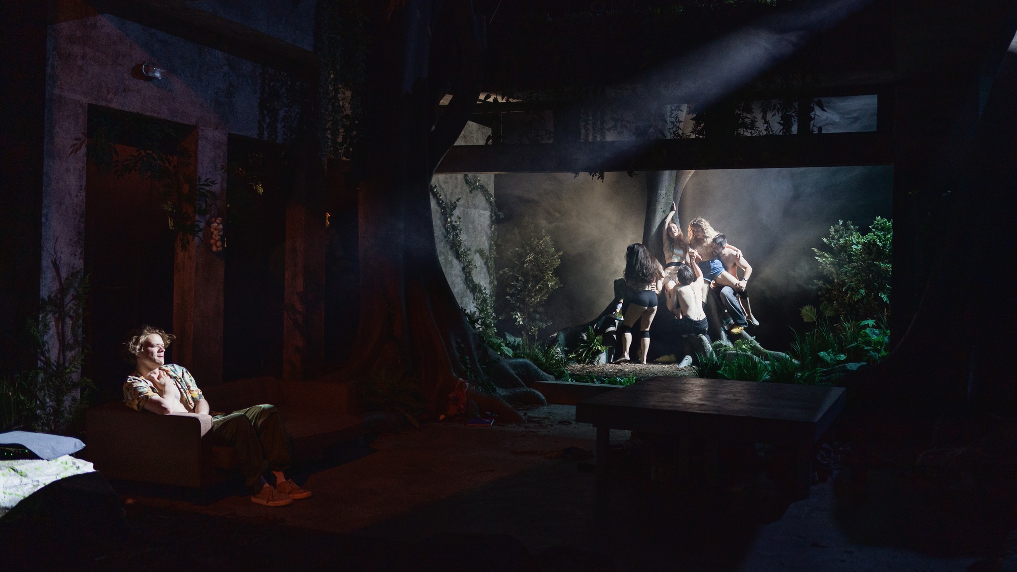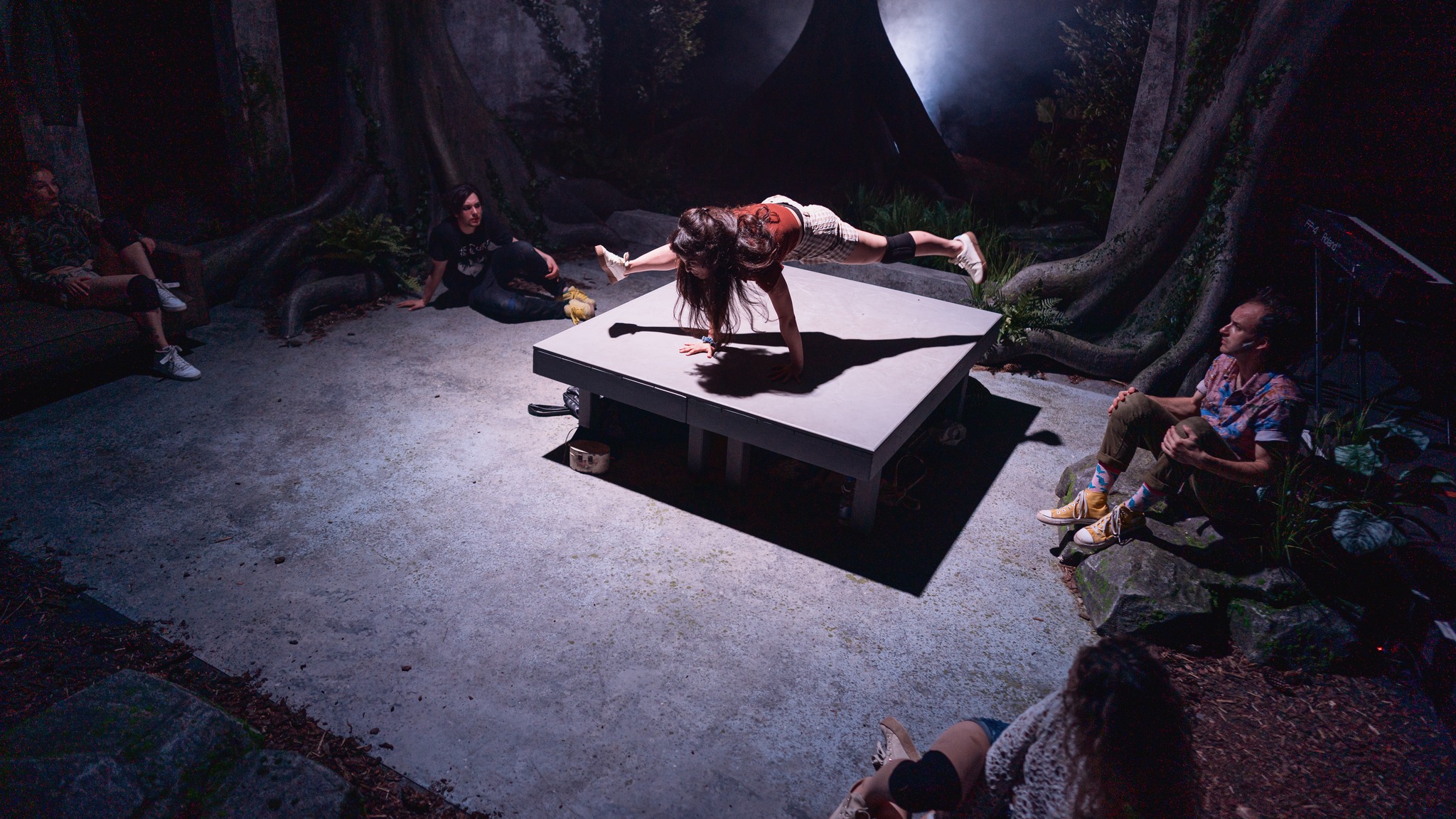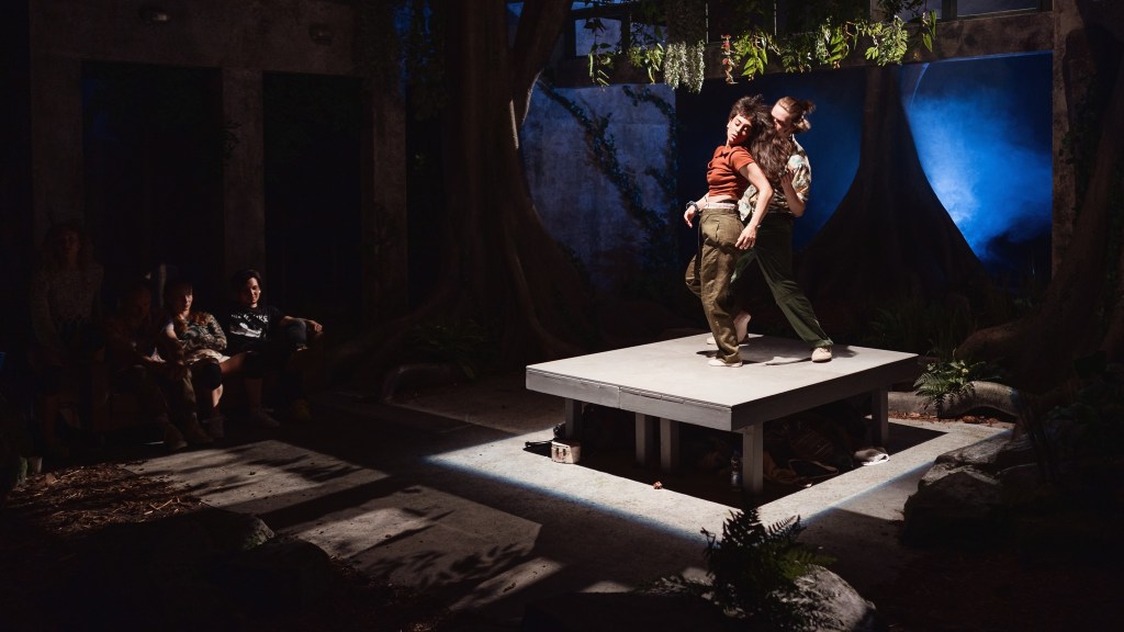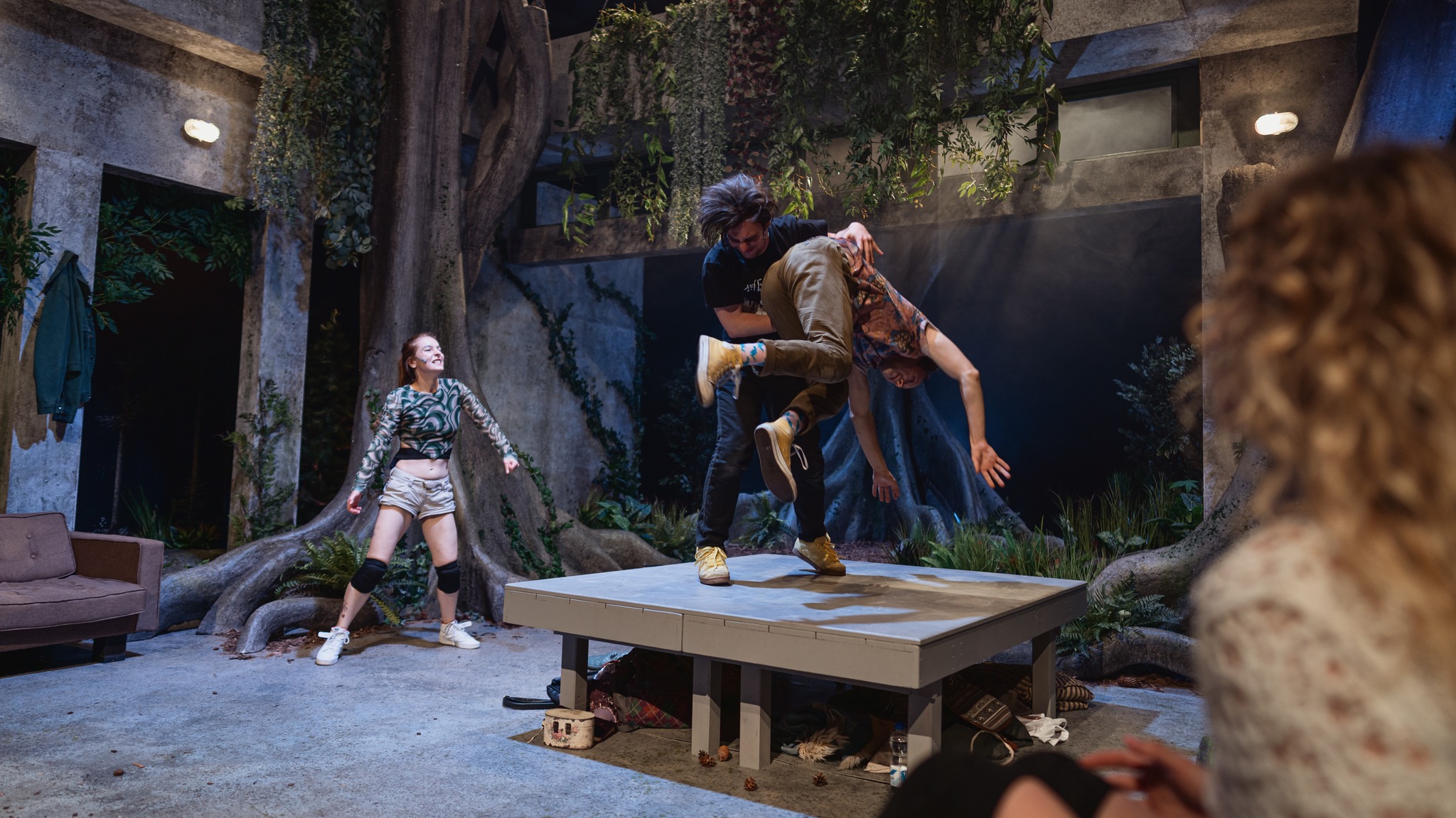 Măsurabil cel mai fizic spectacol al regizorului de până acum, care acoperă dibaci genuri muzicale și explorează coregrafic la maximum calitățile de dansatori ale actorilor (culcat, în picioare, la bară, la trunchi, de-a bușilea sau în genunchi), strângându-le iscusit într-un manifest solid plin de scene-surpriză în care absolut toată lumea se mișcă uluitor prin tranșee, fără încetare, încercând parcă mai degrabă să-și rețină elanul (băgat acolo cu mare atenție la detalii în toate felurile) ce se lovește (doar fizic) ca de un zid de aerul tras cu greu în piept de spectatorii de pe marginea luminișului căscat de Irina Moscu într-o pădure mai mare de copaci de care simțim că atârnăm, încă fără ștreanguri, cu toții (un Doamne ajută! la toată lumea trecută de 27, no rehab resources!) în micuța sală ce adăpostește Cazemata în care clocotește tensiunea asta fantastică, decât să scadă vreo clipă din energia pe care le-a băgat-o sub piele Flavia Giurgiu, reușind să descrie atât de bine sub ochii noștri cu trupurile lor, tensiunea asta a descărnării pe care o resimțim cu toții până ies rezultatele exit poll-urilor și peste câțiva ani.