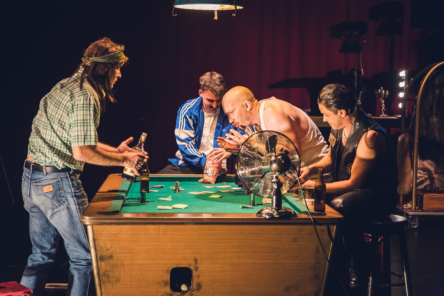 Pe de altă parte, suflarea masculină este grupată în spatele lui Codrin Boldea (câștigător al premiului pentru debut la Gala Premiilor UNITER 2018 pentru rolul Laertes din „Hamlet”-ul lui Victor Ioan Frunză la Teatrul Metropolis), azi un actor consistent și un excelent partener de luptă pentru Corina Moise. El reușește un excepțional Stanley Kowalsky, sergent major în corpul de mecanici, șarmant și impozant, un singuratic plin de vulnerabilități, dur și necioplit ca un braț cu biceps viguros (și lenjerie roșie, nice comment!) antrenat exclusiv pentru a arunca fără încetare bilele grele ale violenței masculine pe pista lungă de bowling pe care-și demonstrează fără încetare puterile, double strike după double strike, în fața tuturor femeilor care-i trec prin preajmă, un anti-macho căruia rolul i se potrivește mănușă, un tip abrupt, cu codul lui Napoleon în dinți (!) și deprinderi de animal primitiv, ca o maimuță din manualele de antropologie (excelent portretul pe care i-l întocmește Blanche, go, go, go Stanley go, go… but Stanley be good… like Johnny!…). Un tip până la capăt grobian și justițiar deopotrivă, cu o remarcabilă intuiție și inteligență neșlefuită de detectiv cu care va descâlci încurcăturile de familie (în timp ce bate la tobe, cred că și Marlon Brando tremură oleacă printre eternitățuri (!)).