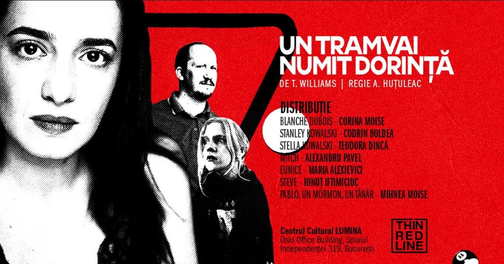 Blanche DuBois. Celebrul personaj în jurul căruia Tennessee Williams a ridicat în 1947 o puternică și fascinantă construcție dramatică, piesa „Un tramvai numit Dorinţă”, care i-a adus în 1948 Premiul Pulitzer pentru teatru. Montată de atunci aproape fără întrerupere pe scenele americane şi în teatre importante din întreaga lume, adesea vizitată și de regizorii din România (cea mai cunoscută montare este cea realizată la Bulandra de Liviu Ciulei în 1965, cu Clody Bertola şi Victor Rebengiuc), „Un tramvai numit Dorinţă” capătă acum o formă nou-nouță în mâinile lui Andrei Huțuleac în primul proiect teatral al Companiei recent înființate Thin Red Line. Un spectacol extrem de solid, cu arome de teatru vechi bun și aer de nou și proaspăt, la care a lucrat împreună cu artiști consacrați (cu care a tras ani de-a rândul în Trupa fără Nume sau frumos crescuți sub luminile rampei de Victor Ioan Frunză), pe numele lor Corina Moise, Codrin Boldea, Alexandru Pavel și Ionuț Iftimiciuc, alături de care a adus inspirat două actrițe fresh de toată frumusețea, Teodora Dincă (ingenua și ludica Stella) șiMaria Alexievici (Eunice, you rock!) și un tânăr student care preia sarcinile de serviciu, caz de ispită sau de targă (Mihnea Moise).