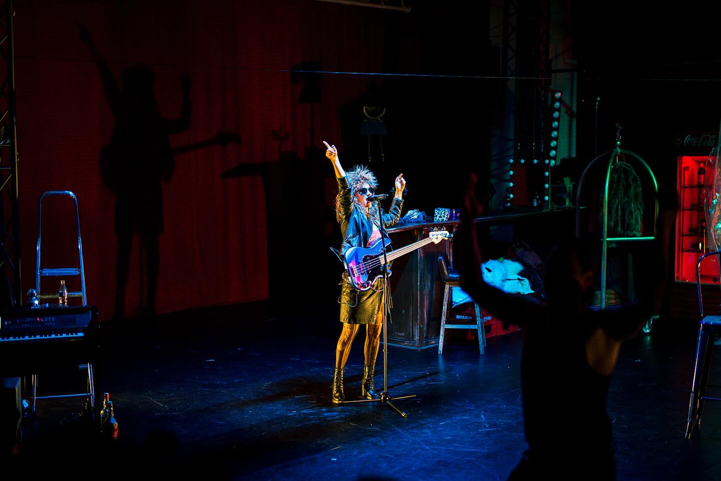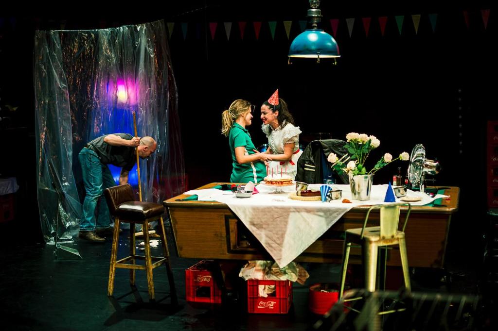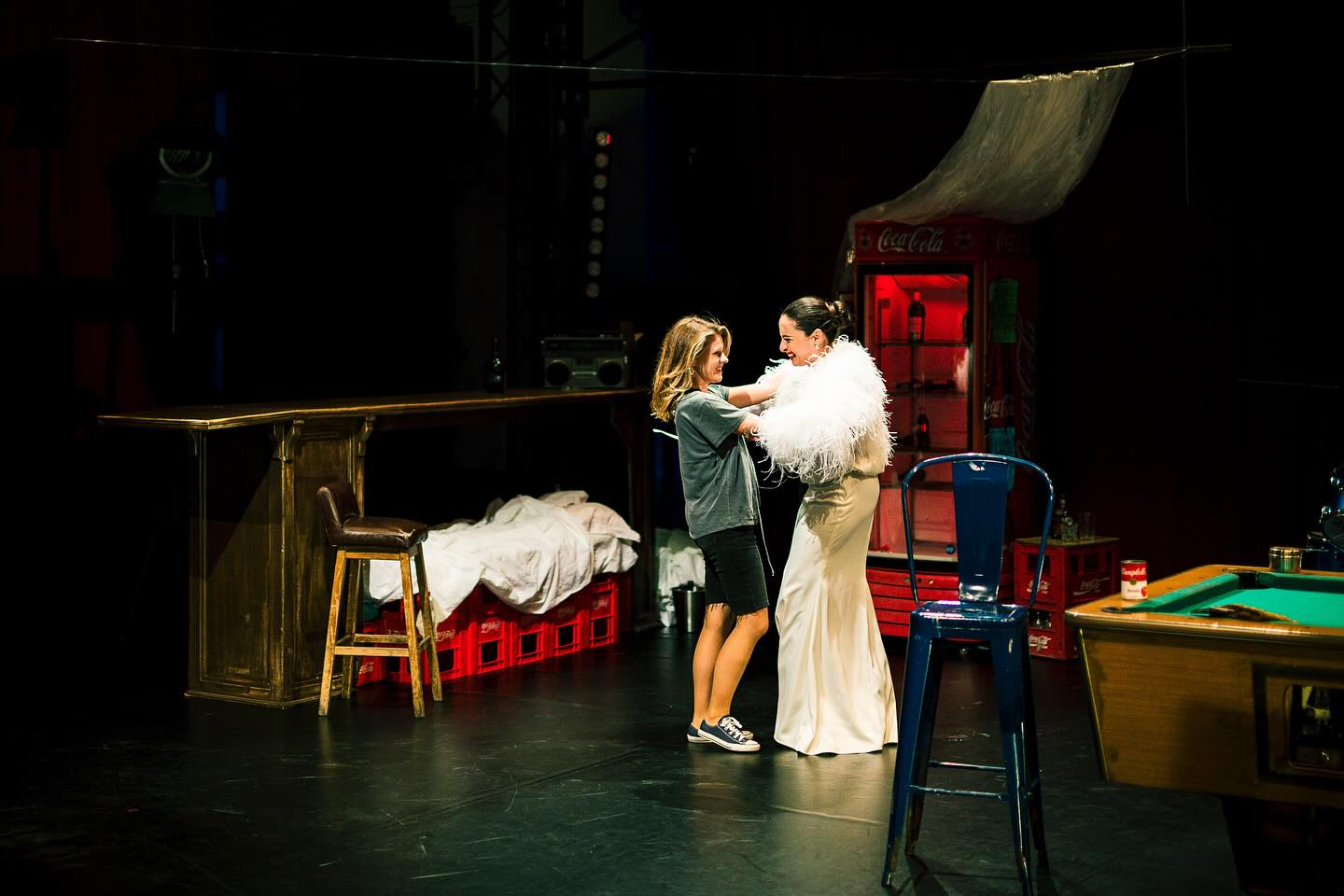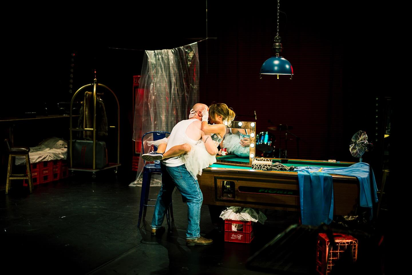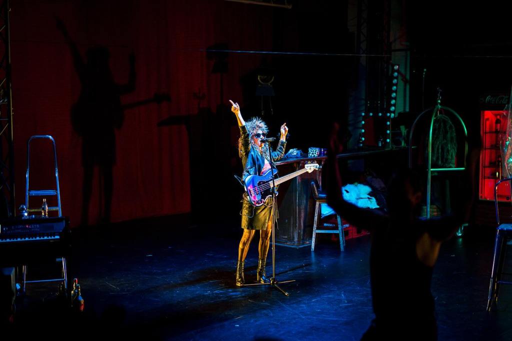 Nu se simte răsuflarea caldă a fluviului cafeniu printre prăvăliile de pe chei cu parfumul lor de banane şi cafea, dar proximitatea Dâmboviței și jocul de exterior cu trimiteri la popicărie și alte dughene ce s-ar afla după colț, adus precipitat către interior de apariția intrusei care a venit să tulbure cu singurătatea ei singurătățile de pe-aici, creează un incredibil decupaj spațial (și o verticalitate ce nu se va pierde nicio clipă pe parcursul spectacolului, atent întreținută de trecerile către și dinspre etaj ale Eunicei, a cărei poftă de hârjoneală trebuie musai și prompt satisfăcută!) ce-i stabilește lesne convenția. Un legământ de conviețuire în care te simți prins, dacă nu chiar în garsoniera modestă și dezordonată, măcar în clădirea care-i adăpostește mizeriile și dezordinea (depinde unde ești așezat în sală), printre sticle goale sau neîncepute, resturi alimentare, mobile improvizate din navete de Coca-Cola, sâni și șolduri din linii luminoase și instrumente semi-abandonate, potrivită și cu dimensiunea muzicală (live!) a spectacolului înțesat cu ritmuri și nostalgii recognoscibile (nu polka Varşoviana și cântecele muzicanţilor negri invocate de Williams, ci unele dintre cele mai puternice acorduri rock și rock’n’roll ale ultimului secol, care va opri atmosfera evocată, sugerată și de costume, undeva printre nostalgiile anilor ’70) ce-și azvârle strindențele și decibelii către noi, ispitindu-ne violent și răspicat să ne identificăm propriile eșecuri.