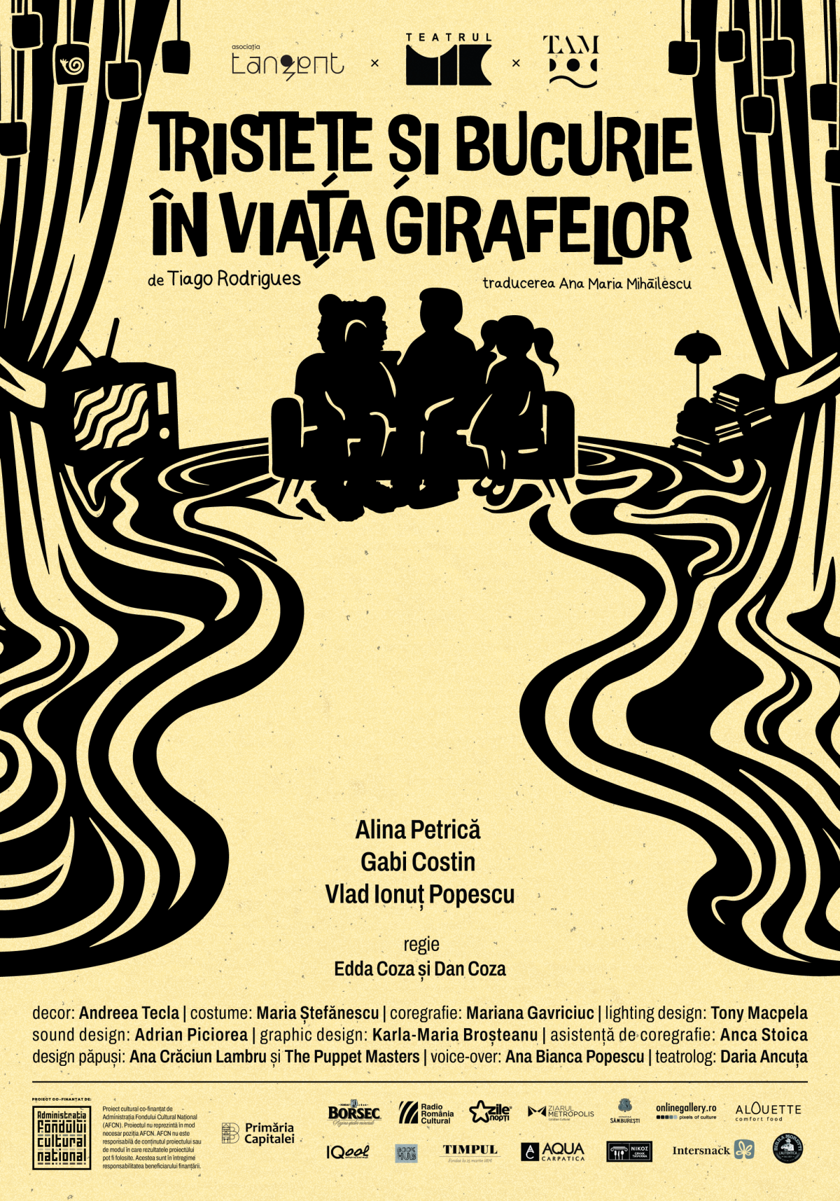 Tristețe și bucurie în viața girafelor este un proiect cultural coprodus de Asociația Tangent, Teatrul Mic din București și Teatrul „Alexie Mateevici” din Chișinău și co-finanțat de Administrația Fondului Cultural Național (AFCN). Proiectul nu reprezintă în mod necesar poziția AFCN. AFCN nu este responsabilă de conținutul proiectului sau de modul în care rezultatele proiectului pot fi folosite. Acestea sunt în întregime responsabilitatea beneficiarului finanțării.