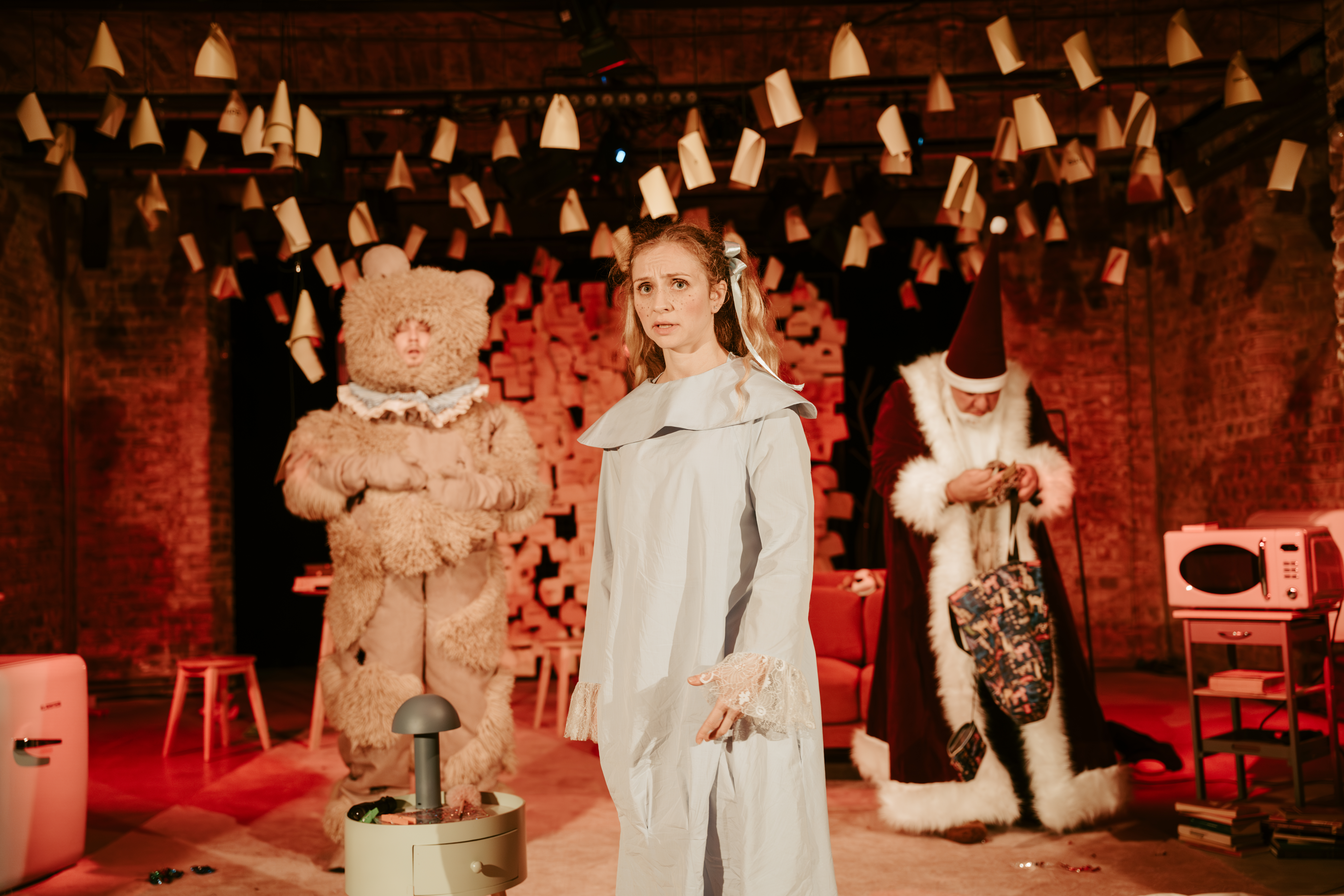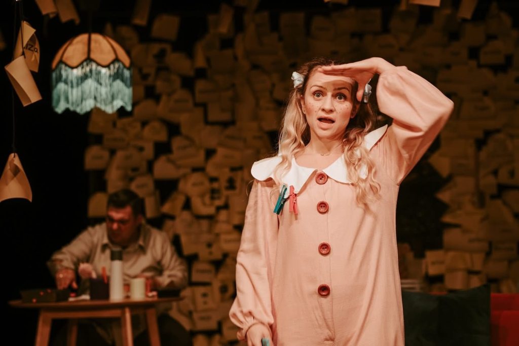 Cred că atuul spectacolului rezidă în dozele de ingenuitate, ironie și autoironie (chiar sarcasm pe alocuri), inteligent drămuite și alternate regizoral pentru a fixa și a ține agățată lacrima în colțul ochiului spectatorului, pregătit în fiece moment de cei trei minunați actori ai Teatrului Mic să izbucnească în hohote, de râs sau de plâns, după cum merge replica și treaba în scenă. O scenă intimă, construită cu mare atenție la detalii în interiorul tapetat cu post-it-uri al casei familiei, pe mocheta căreia Andreea Tecla te invită să pășești cu grijă, fără să deranjezi jucăriile de pluș (!), după ce Maria Ștefănescu le-a pregătit minuțios gazdelor haine comode de casă, de joacă și de joc (foarte ingenios costumul ursului în care e vârât șarmant simpaticul Vlad Ionuț Popescu, la fel și obiectele de vestimentație ale mamei, augmentate și accesorizate cât să păstreze farmecul și să asigure funcționalul în aventura în care acesta va porni alături de fetiță, în pașii de poveste atent coregrafiați de Mariana Gavriciuc).