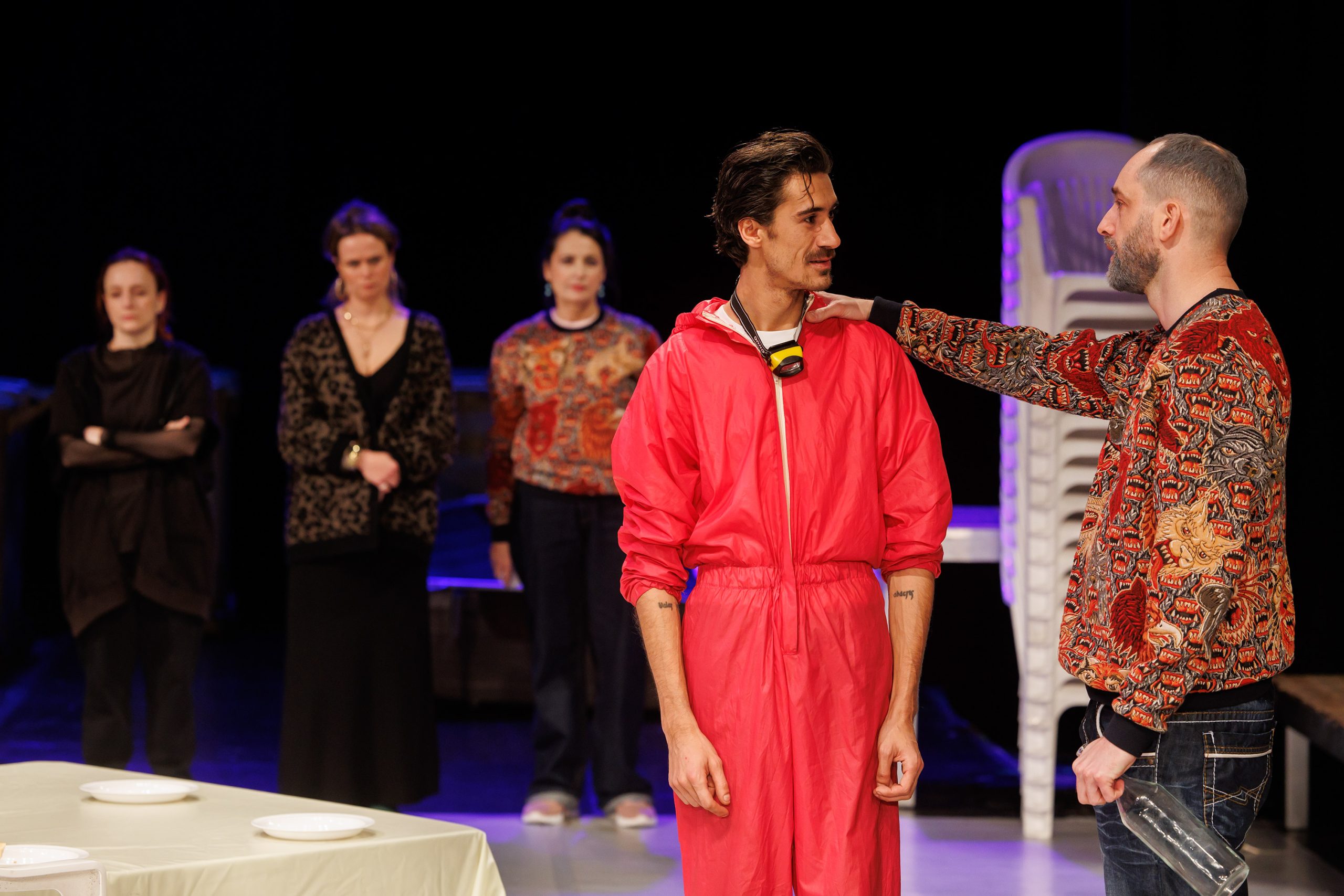 Într-o atmosferă generală de promiscuitate, excelent patronată de Diana Cavallioti (Mirela, proprietara pensiunii din Deltă, autoare a unui minunat crescendo de interpretare pe parcursul spectacolului, într-o prestație tot mai plină de nuanțe pe măsură ce se golesc tolba de povești și sticlele, presărată cu câteva momente delicioase, cu mare priză la public – excelentă scena enumerării (!)), mare amatoare de discursuri, de pahar și de capi de familie (!) care-i aduce pe toți sub acelați acoperiș. Cu imoralul gata pregătit încă de la distribuția locurilor de cazare ce încurajează necuviința, de care nimeni nu pare străin, așezându-l de la început și pe Ovidiu Niculescu în rolul ingrat de părinte nedemn de respectul copiilor, un tip lasciv, curtenitor și descurcăreț, trecut dar încă verde (!), plin de prejudecăți și verdicte intransigente despre lume și mai ales despre copiii săi, adevărații protagoniști ai celei mai noi drame de familie.