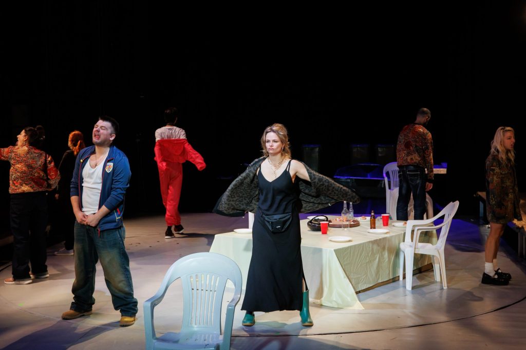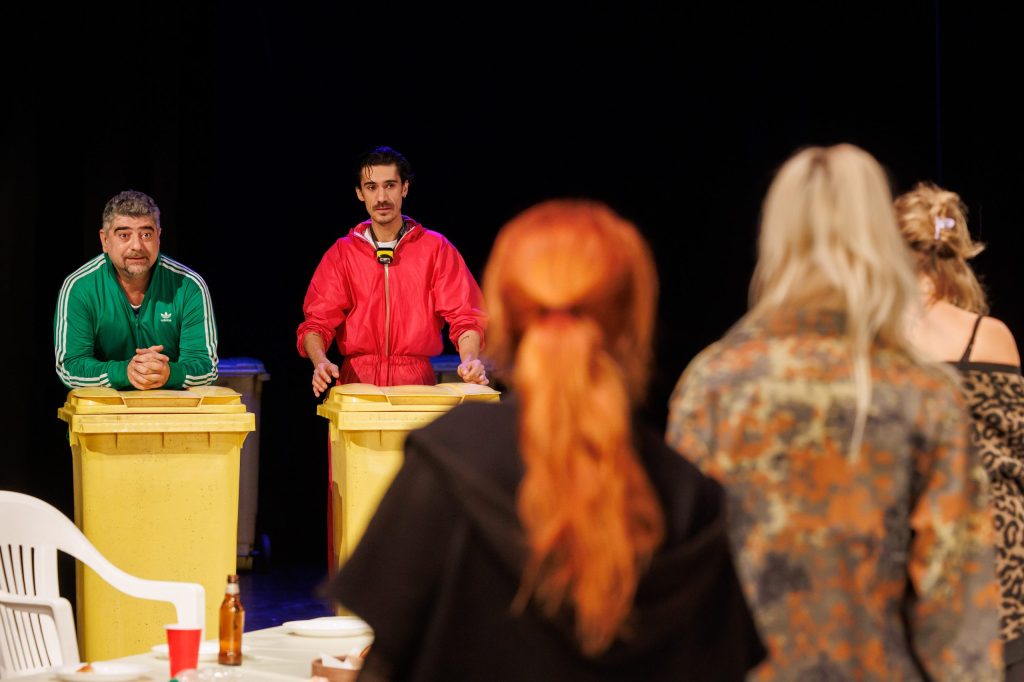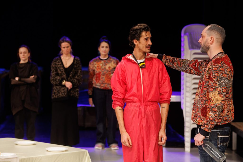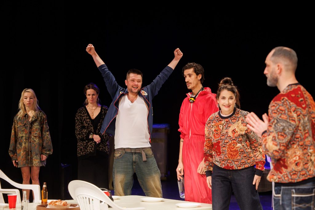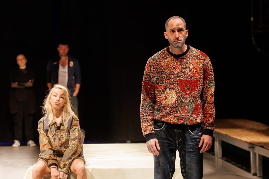 Fiica lui, din nou o excelentă Ana Bianca Popescu în rolul Ramona, în care intră și din care iese magistral, la vedere, care-și alimentează furia și răbufnirile din amintirile de familie și, mai ales, din interacțiunile zgomotoase cu prietena ei unguroaică Reka (ca de obicei impecabil și Ilinca Manolache, în rolul de fată rea și rebelă care-i pune foarte bine în valoare calitățile, fata de la București cu care-și împarte locativul și iubitul într-un mod care a devenit insuportabil pentru fiecare dintre ele – dar care e și cel mai important dinamic parteneriat în scenă), pentru a le aduce înapoi să le detoneze pe diverse teme în familia unde nu va găsi niciodată spațiu pentru descărcarea, empatia și suportul de care ar are atâta nevoie și pe care nici măcar fratele ei Răzvan (foarte bun și Alexandru Voicu), colegul ei de suferință în lipsa mamei și vocea conștiinței în relația cu publicul (căruia îi recunoaște lucid toate imperfecțiunile familialului) nu i le poate oferi. Mai ales acum, când li se cere amândurora un nou sacrificiu pe altarul genealogicului în favoarea vărului Ionuț (Marian Olteanu), un tânăr virgin, răsfățat și naiv, prea puțin dispus să pună osul la vreo treabă, în căutare de plocoane de la viață, femei și mai ales de la familie, care trebuie că e singura responsabilă de bunăstarea și viitorul lui. O mamă simpluță, tipicară și ipocrită (Liliana Pană), exagerat de grijulie, care s-a refugiat în maternitate și căsnicie pentru a se simți utilă și puternică, poziție din care caută să manipuleze întrega familie emasculându-și partenerul, pe Viorel al unui excelent Tudor Aaron Istodor (cel mai complex rol din scenă, cu partitură generoasă în economia spectacolului, care îmbracă inspirat în metaforă tarele relațiilor masculin/feminin și părinte/copil). Personajul care se refugiază cel mai bine în fantezii, sub identitate canină, de unde comentează la superlativ metehnele umanului și familialului, alternând cu momente explicative, și ele mai generoase decât ale celorlalte personaje (toate interpretările beneficiază de această dedublare, care asigură verosimilul și firescul poveștii și individualizează interpretările, colorând nuanțat monologurile rezervate fiecărui actor spre a-și dovedi măiestriile de interpretare, dar și părerile cvasipersonale despre toate temele aduse în discuție).