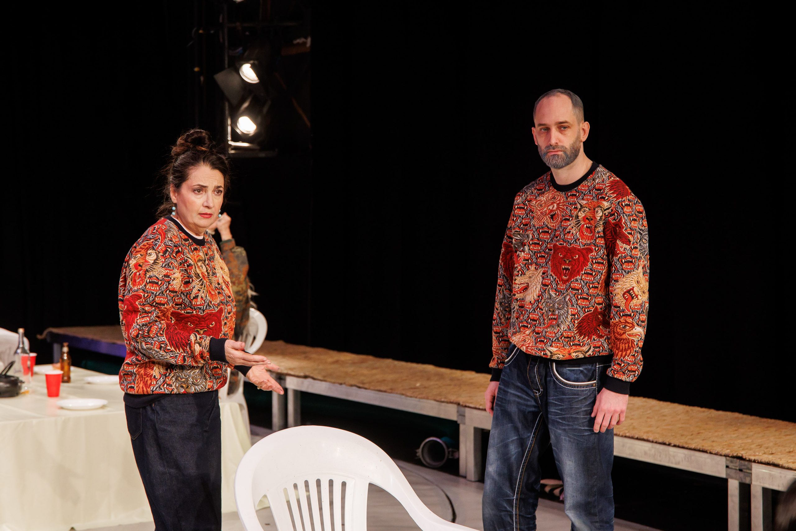 Cu oglinda pusă curajos în față tururor și fiecăruia în parte, colorată strident de scenografa Ioana Pashca, mai ales la nivel de costume, cât să ne imprime memorabil pe retină particularitățile fiecăruia și tabloul general al dizarmoniei, un fel de prelungire la nivel vestimentar a trăsăturilor pestrițe de caracter care ne împing alert în dramatic printre clișee, derapaje și intoleranțe de toate felurile, zugrăvite laolaltă într-un vizual familial și familiar reverențios și obraznic, straniu și fascinant, pătrunzător și repulsiv deopotrivă, atât de ușor de recunoscut la fiecare deschidere de pleoapă prin identitarul, peisajul și amintirile apăsătoare ale românilor (excelentă ideea folosirii scurtelor roluri sociale, către care sunt dirijați din când în când actorii, sau a mărturiilor din vestimentație precum puloverele gemene de familie (!)), că n-are cum să nu lase urme pe suflet fiecărui copil interior care refuză să-i mai fie testată haotic încrederea în el și în univers, care nu mai dorește să-i fie judecate alegerile, care încă mai așteaptă pe cineva care să-l audă când are ceva de spus, dar și când nu are ceva de spus.