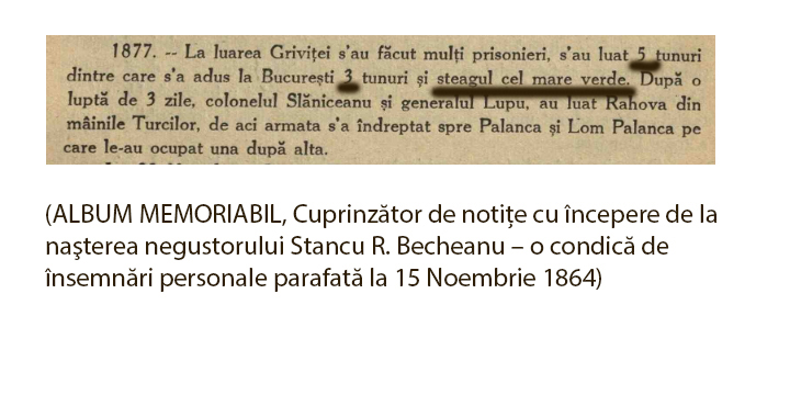 Nu am găsit nici până în ziua de azi fragmentele la care mă gândisem inițial și pe care știu că încă le caut (nici nu mi-aduc aminte precis unde le-am întâlnit odată), dar cum cuvântul Grivița a început să-mi sară adesea în ochi după întâlnirea cu Chris și mi-a întors acum iar sufletul la câteva documente publicate de domnul Angelescu în interbelic (pe care le-am răsfoit doar digital), scotocind încă o dată (cu titlul spectacolului de inaugurare în minte) mi-a sărit în ochi următoarea frază: „La luarea Griviței s’au făcut mulți prisonieri, s’au luat 5 tunuri dintre care s’a adus la Bucureşti 3 tunuri și steagul cel mare verde“… („ALBUM MEMORIABIL, Cuprinzător de notițe cu începere de la naşterea negustorului Stancu R. Becheanu – o condică de însemnări personale parafată la 15 Noembrie 1864“, publicat în „Negustorii de altădată“).