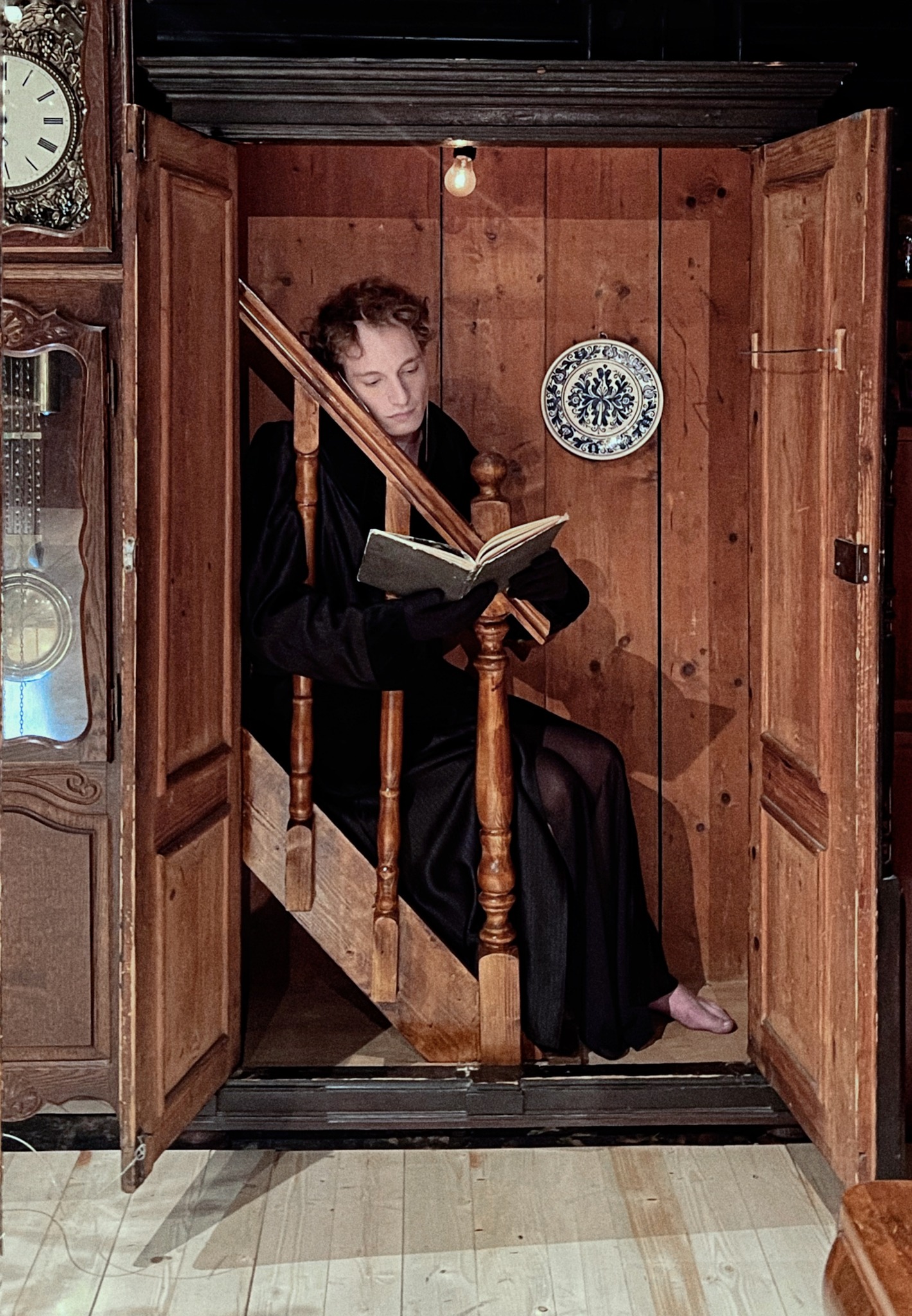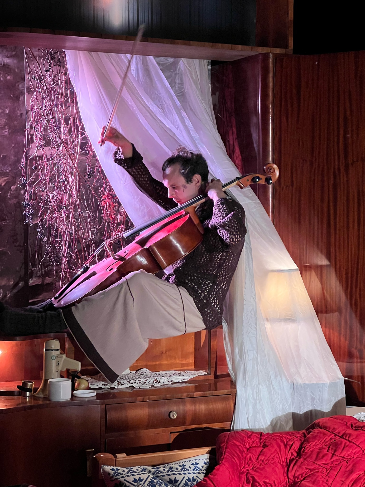Kónya-Ütő Bence. Excepțional rol! O gazdă neobișnuită pentru un locuibil la fel de neobișnuit. Un grof al văzduhului care ține spectacolul în mână în tremolo grav și casant, la vedere, ca șuieratul vântului într-un anotimp bun în care învață să-și treacă dibaci armoniile printre tot felul de crengi înfrunzite ale copacilor dintr-o pădure deasă și neprihănită din care și-a extras parcă esențele vibrante, gata ruginite (de rostire, de atitudine corporală, gestuală, coregrafică), crescute mlădios-bâlbâit între palmele magistral fremătate ale lui Huba, acum obosite, cu care personajul își revelează recunoștința între degetele închise semiparetic în simbolul inimii în plină pulsație. O inimă largă, iubitoare și singuratică ce-și trăiește la superlativ mirările și inocențele, un suflet incandescent, ce poate citi demult în întuneric la propria lumină, care iubește deschis solitudinea, natura, cărțile poștale și notele muzicale, după care-și tot trimite degetele umblătoare, mereu în căutare de ritmuri, cremă de mâini și arcuș, cu care se agață de portativ, de promisiunea făcută mătușii și de aerul trecut ferm peste theremină, singurul instrument care-i mai poate valida măiestria. Pentru că povestea pe care are să ne-o spună are nevoie de tot plauzibilul pe care îl poate cuprinde în realitate ca să se desprindă de fabulosul ce i-a fost încredințat. Și pe care actorul îl ridică atent, identificându-i firescul și verosimilul pe care le explorează concentrat, în ciuda accelerărilor și spasmelor propuse personajului său în permanentă mișcare în sine și în scenă.