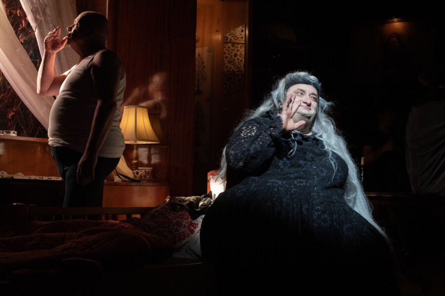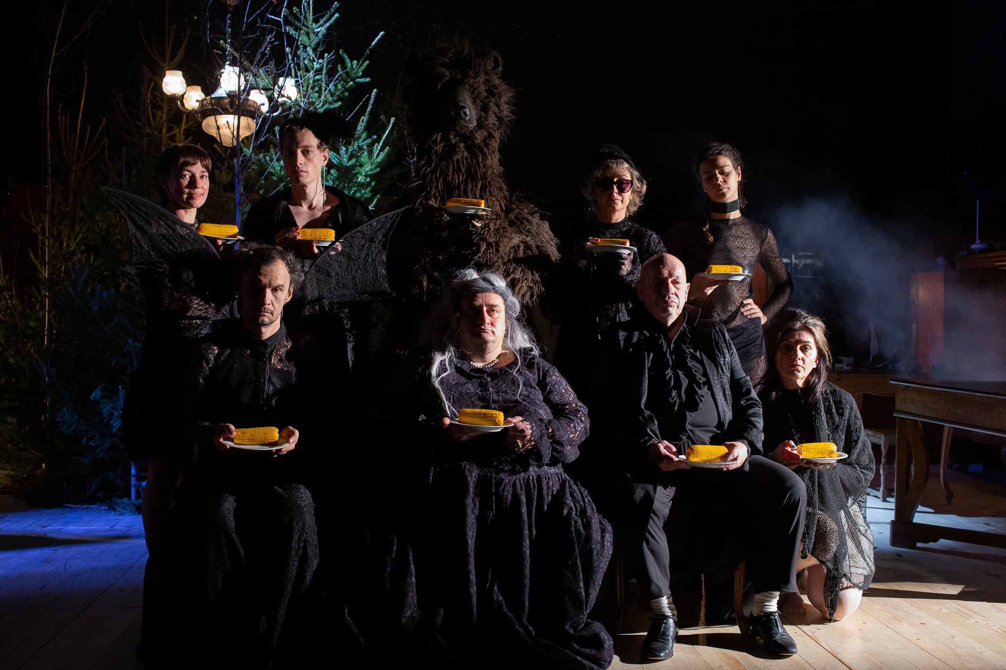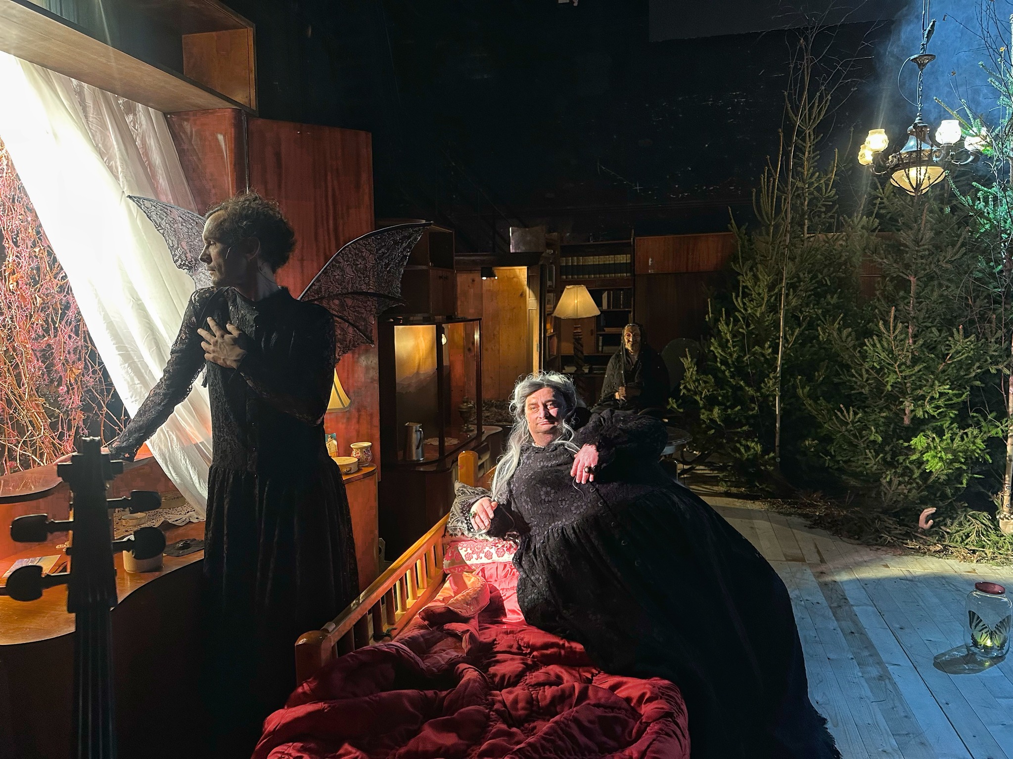 Firesc pe care-l imprimă chiar și relației cvasirealistice cu mătușa Sarolta (un travesti senzațional reușit de Erdei Gábor în rolul baronesei, construit după prototipul afrimian pentru acest gen de rol feminin smuls din propria feminitate, urcat pe umerii unui gigant și scăpat savuros în purtări de domnișoară, combinație cel mai adesea dulce-vulgară cu maximum de impact emoțional), o mamă de copii nenăscuți și de aceea mereu evocați, un munte de ritmuri și de energie, bârfe vechi și povețe pentru cleveteli mai noi (!) în care nepotul a găsit mereu sfat și alinare, gazda de facto a acestui loc aproape imaginar în care mătușa baronesă ne vizitează vigilent (în multele nopți impare petrecute în micuța comunitate după ce conacul se va deschide vraiște, nu doar fără să le perturbe celor doi întâlnirile, ci lesne adoptată de grupul căruia nu i-a fost nicio clipă ascunsă identitatea metamaterială) de pe cealaltă lume, cea veche, spre a aduce ceva ordine în asta nouă, gata îndoliată à la Addams (bravas Pál Alexandra!), cotropită și încă lipsită de reguli, de la granița pe care nu e dispusă să o treacă și care o ține agățată în imaginarul unor ființe aproape reale (!).