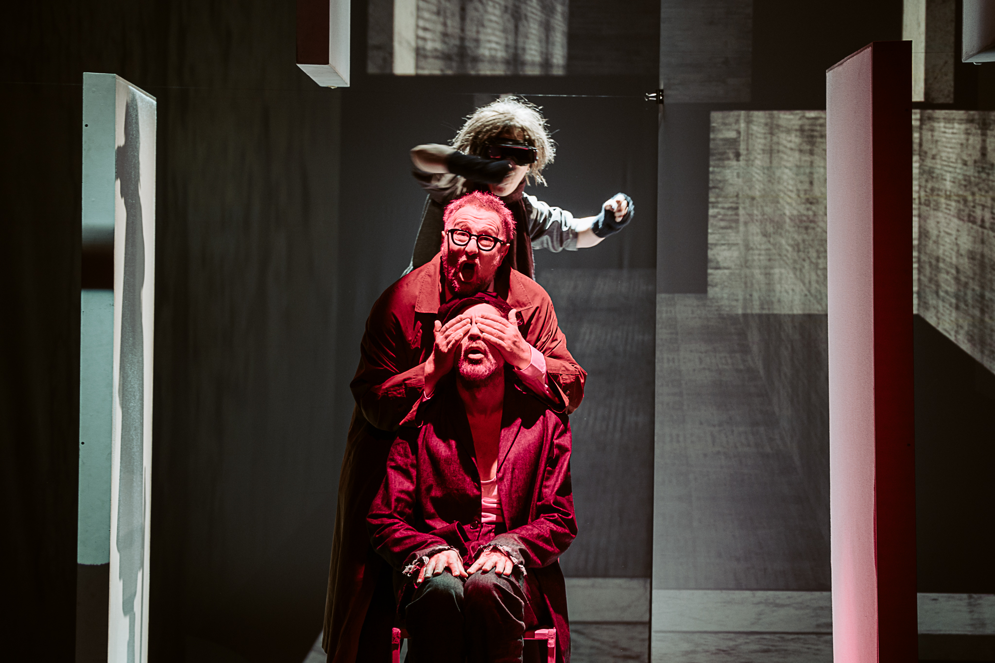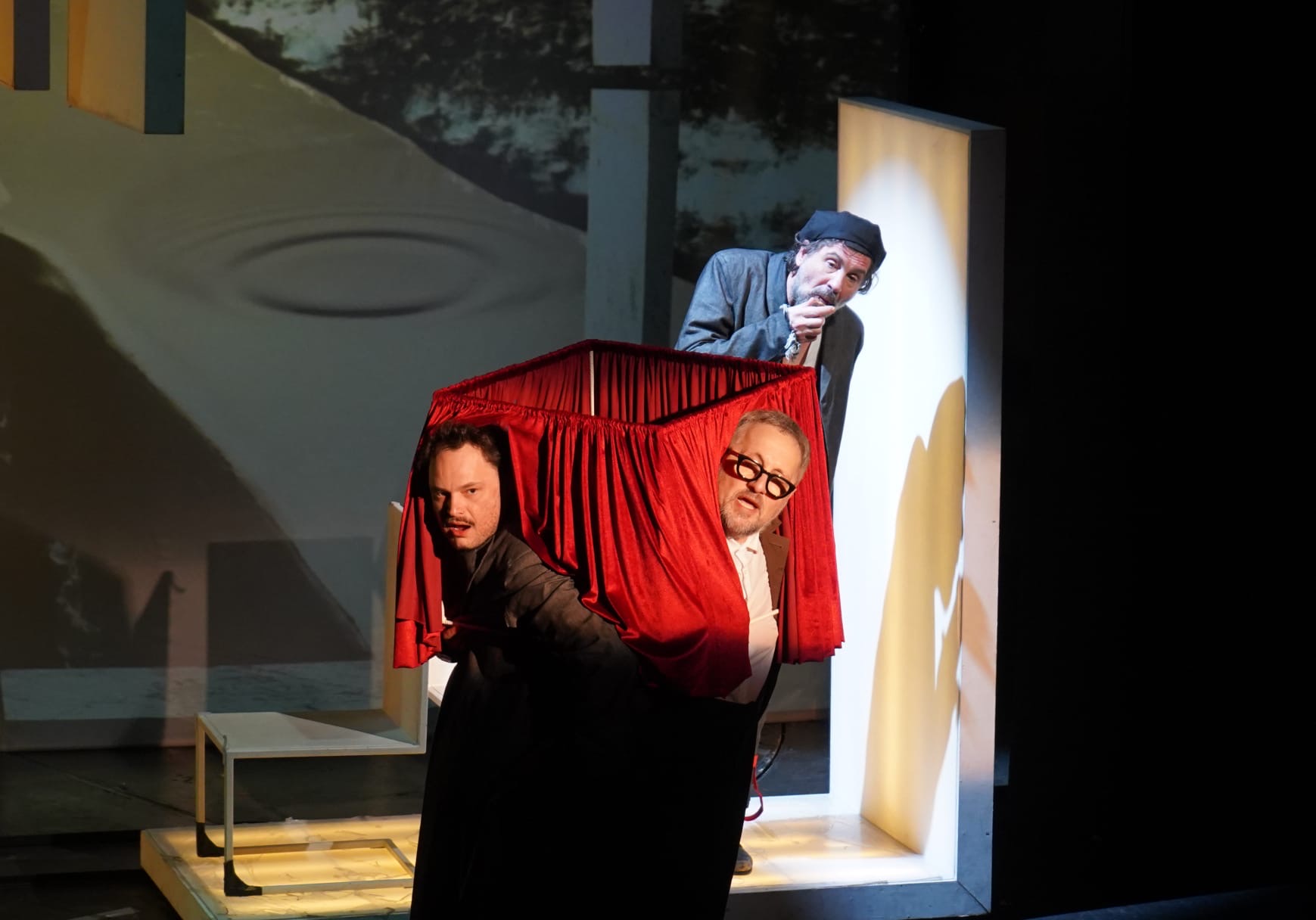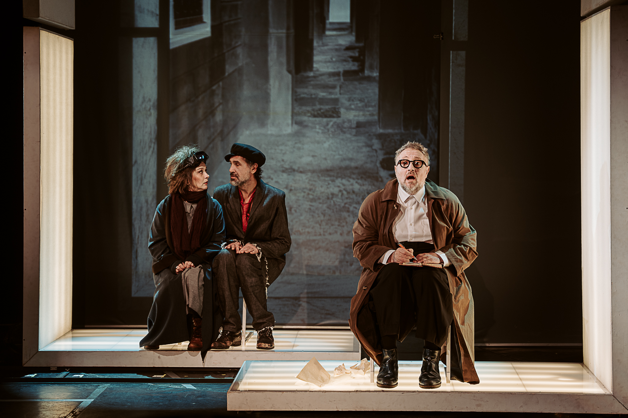 Nona Ciobanu ne ține în șah continuu la rege (un excepțional Vitalie Bantaș în rolul Choubert), unul disperat al dramei, explorat într-o stare de permanentă mirare și hipervigilență reținută, excelent asumată, care nu pare să găsească, în ciuda strădaniilor pe care nu se precupețește să le depună (până la coborârea adâncă în noroi, spre a-și salva inocența, statutul și căsnicia), mutarea potrivită pe tabla de luptă alb/negru ce-și redefinește la nesfârșit liniile și câmpurile bine/rău (și Peter Košir joacă șah scenografic cu orizontalele, verticalele, curbele și adâncimile din proiecțiile de fundal ale spațiului scenic, recompus la nesfârșit într-o succesiune rapidă de tablouri teatrale cu rame în mișcare în care personajele încearcă să încapă sau din care caută să evadeze, în diverse straturi ale conștientului, imprimând atmosferei de spectacol senzația de fatidică alunecare, claustrare și sufocare) amenințându-l mereu cu retragerea în pătrățica lui de joc unde va fi făcut, inevitabil, mat. De propria regină (Simona Mihăescu tonică, vioaie și dezinvoltă în rolul Madeleine, din care-i ține sau întrerupe delicios isonul, schimbând la nevoie echipa), de regele echipei adverse, supraeul – și deopotrivă sistemul inert – în chip de polițist (intransigentul Bogdan Talașman, aici un maestru al subversivului), de nebunul de negru (coechipierul poet ce va deschide diagonalele discursului teatral, Nicolas d’Eu al unui precis Ionuț Vișan) sau chiar (ori mai ales?) de un pion oarecare de pe marginea tablei de joc (Ruxandra Enescu / Manuela Hărăbor), care nu se știe când și dacă va fi folosit sau iarăși cruțat, nu-i așa Doamnă?!…