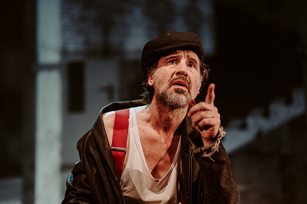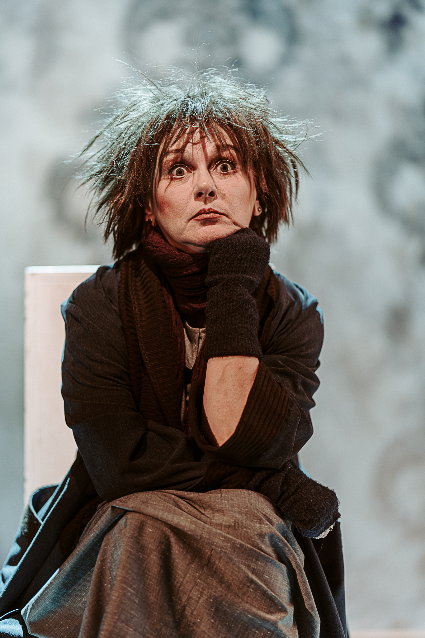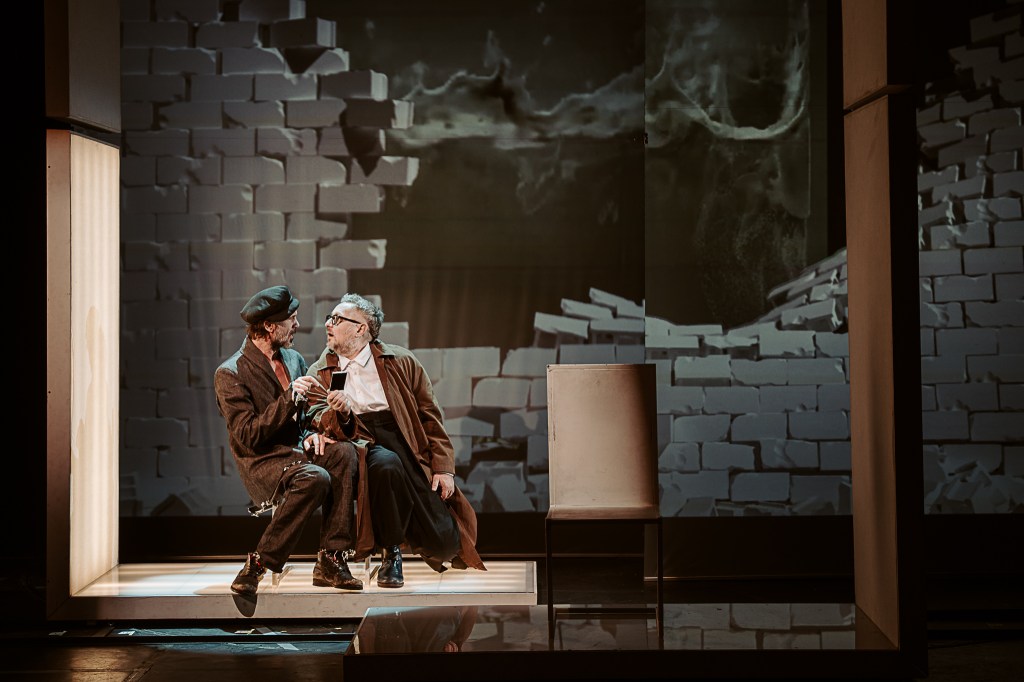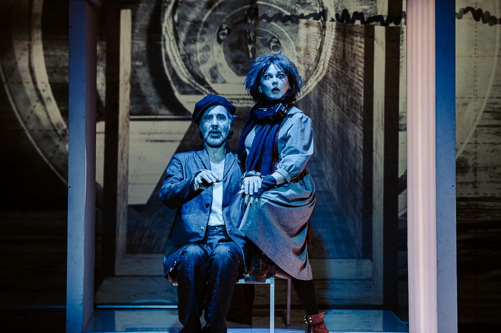 Nona Ciobanu ne ține în șah continuu la rege (un excepțional Vitalie Bantaș în rolul Choubert), unul disperat al dramei, explorat într-o stare de permanentă mirare și hipervigilență reținută, excelent asumată, care nu pare să găsească, în ciuda strădaniilor pe care nu se precupețește să le depună (până la coborârea adâncă în noroi, spre a-și salva inocența, statutul și căsnicia), mutarea potrivită pe tabla de luptă alb/negru ce-și redefinește la nesfârșit liniile și câmpurile bine/rău (și Peter Košir joacă șah scenografic cu orizontalele, verticalele, curbele și adâncimile din proiecțiile de fundal ale spațiului scenic, recompus la nesfârșit într-o succesiune rapidă de tablouri teatrale cu rame în mișcare în care personajele încearcă să încapă sau din care caută să evadeze, în diverse straturi ale conștientului, imprimând atmosferei de spectacol senzația de fatidică alunecare, claustrare și sufocare) amenințându-l mereu cu retragerea în pătrățica lui de joc unde va fi făcut, inevitabil, mat. De propria regină (Simona Mihăescu tonică, vioaie și dezinvoltă în rolul Madeleine, din care-i ține sau întrerupe delicios isonul, schimbând la nevoie echipa), de regele echipei adverse, supraeul – și deopotrivă sistemul inert – în chip de polițist (intransigentul Bogdan Talașman, aici un maestru al subversivului), de nebunul de negru (coechipierul poet ce va deschide diagonalele discursului teatral, Nicolas d’Eu al unui precis Ionuț Vișan) sau chiar (ori mai ales?) de un pion oarecare de pe marginea tablei de joc (Ruxandra Enescu / Manuela Hărăbor), care nu se știe când și dacă va fi folosit sau iarăși cruțat, nu-i așa Doamnă?!…
