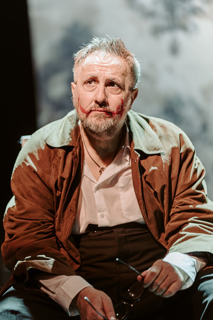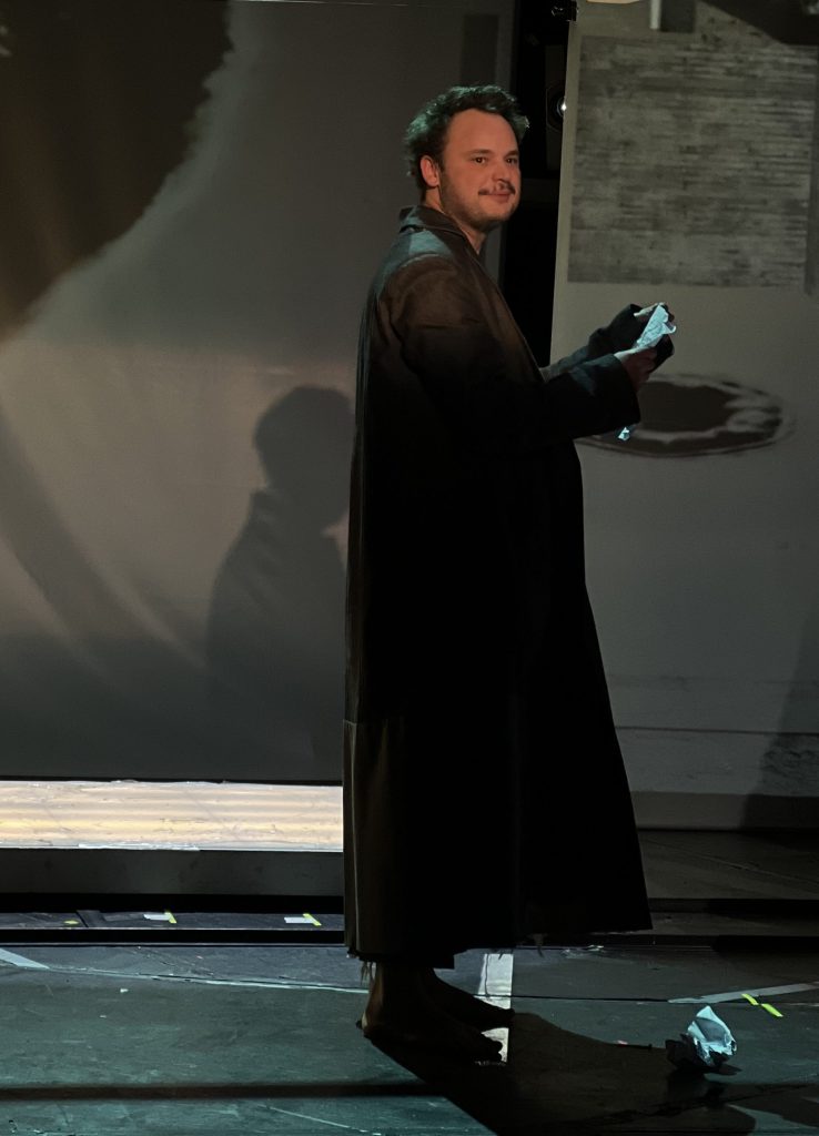 Denunțul la care este invitat Choubert declanșează evadarea din geometria restrictivă cu pereți tapetați și învechiți a orizontului cunoscut și coborârea în întunericul interior, spre care este mânat cu mari insistențe (ajutat și de proiecțiile care-i limitează încet spațiul labirintic exterior, cu coridoare înțesate de trepte, uși și ferestre cu infinite posibilități de ieșire, distorsionate, destrămate și înlocuite încet de universuri fluide, gazoase ori multidimensionale în care se cască mereu viduri, cavități amorfe și tuneluri ce-i forțează suspendarea, lunecarea și coborârea), că doar orice recomandare se transformă întotdeauna în ordin și sugestiile devin peste noapte regulamente și legi draconice, cum zice și la gazetă și în teatrul învechit ce se cere revoluționat (!). Din universul lui lăuntric trebuie musai să extragă amintirile necesare anchetei (și actului de creație), pentru că acolo zac, încă nerezolvate, traumele din copilărie și tinerețe – mai ales de respingere și abandon – desfăcute inteligent în monologuri consistente și emoționante, amestecate cu nostalgie și frici mai noi dezvoltate sub amenințările anchetatorului (legătura tensionată a părinților, amintirile cu mama suferindă cu tendințe suicidale, relația dificilă cu tatăl lui violent și necomunicativ, bucuria iubirii de care a fost prădat prin fatidica veștejire a trupurilor și sentimentelor cele mai arzătoare) afundate cu toată vina și mila de sine în mocirla războiului și terorii care i-au compromis toate șansele la fericire. Vitalie Bantaș amestecă inteligent la vedere straturile de naivitate autentică și cele necesare camuflării în fața răului (renunțarea e oricum și politică și mistică în același timp (!)), „căutatul” din fotografie (Răul numit de sistemul care i-a aplicat deja o mică și necesară corecție înainte să fi dispărut, un Rău care nu poate fi găsit decât la fund, în cel mai gros noroi) fiind nu doar miza anchetei (enigma de dezlegat dramatic în teatrul enigmatic/polițist/naturalist/contemporan, poate chiar de specialiști, fie ei agronomi sau veterinari (!)), ci și miza personală de rezistență în fața sistemului opresiv. Intențiile de tăinuire devin evidente prin abandonarea bruscă a inchizitorului văduvit de fiecare dată de câte o informație la un pas de a deveni prețioasă, sedus mai întâi cu fiecare amintire mai însemnată pentru mersul anchetei și rătăcit anume în divagațiile atent dirijate către episoade de istorie personală.