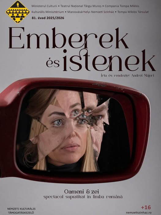 „Emberek és istenek” / „Oameni și zei”. De multe ori unii și aceiași, la un pas, un claxon, un gest, un surâs, un acord sau doar un cercel (!) distanță de dumnezeire ori întrupare. Cuvânt împreună despre frumoasa și greu încercata condiție a slujitorilor scenei care ridică adeseori magia din mai nimic, provocați de dramaturgul și regizorul Andrei Măjeri să iasă din cunoscut (și chiar din uman) și să-și înfrunte limitele angelicului și diabolicului propriu înainte de a deveni zeii și demonii altcuiva. Un drum greu, cu sinusuri și succesiuni de curbe deosebit de periculoase, primele spre stânga (!), înaintând haotic prin ipotetic până la ciocnirea finală dintre realitatea proprie și realitatea celorlalți.