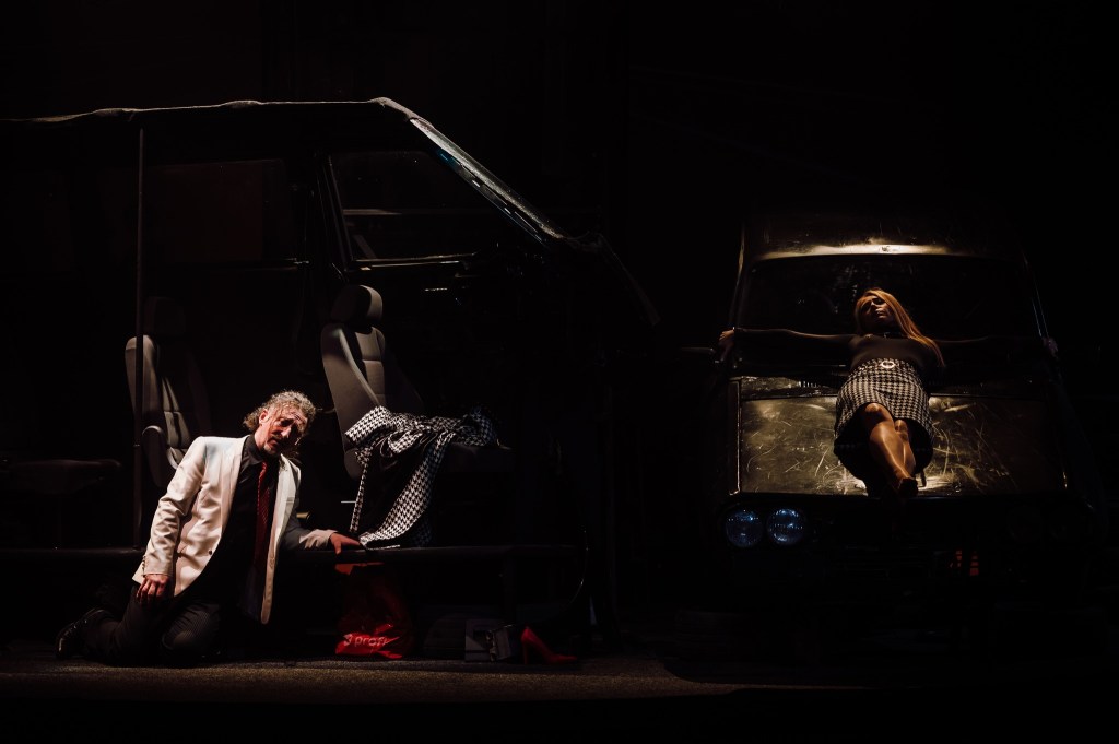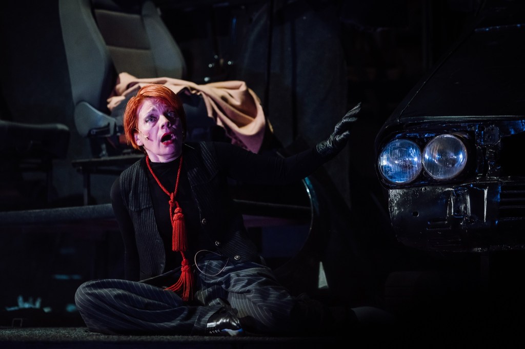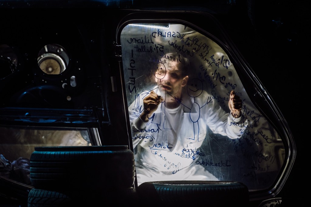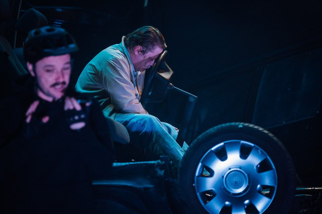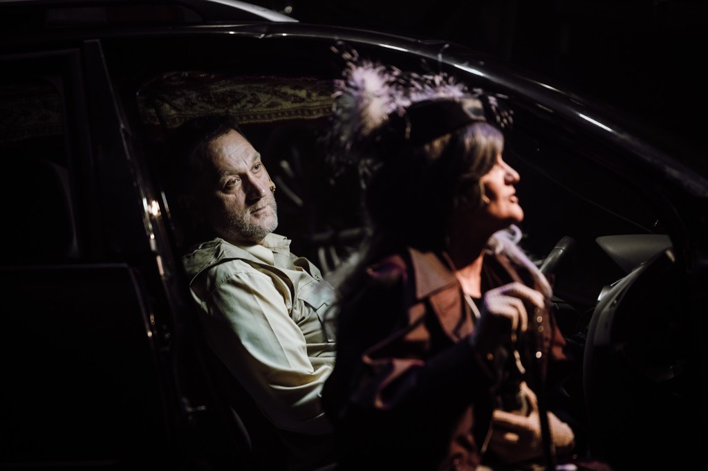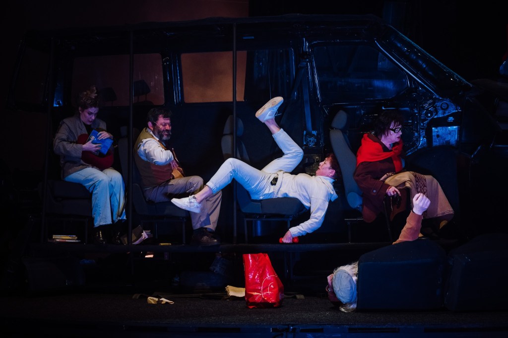 Cea din urmă agent dublu (înlocuind pentru o clipă Moartea însăși!), deja infiltrată în grupul de teatrologi ce nu mai poate analiza prezența lor în premiera acestui spectacol (!), un grup de critici, blocat în caroseria microbuzului ce urma să-i aducă la Târgu Mureș, rămas să reflecteze autoironic de departe, de pe lumea cealaltă, asupra rolului teatrului și al propriei lor meniri (Hajnal, Viki, Kata și Berci, cărora Hajnal Somody, Viktória Renczés, Bea Fülöp și Gábor Tollas le desenează cu mult umor frici plauzibile, atitudini demonstrative și raporturi de forță prin care analizează viscerele acum căscate ale lumii ce se deshide la propriu la picioarele lor, lângă caroseria umanității mici de proximitate, preocupată excesiv de siluetă, aspectul fizic, recunoașterea intelectuală și ultimul selfie cu Moartea (dar și de diurnă ori de scoaterea în afara relevanței discursului critic al vremurilor – orice asemănare cu realitatea nu e tocmai întămplătoare…) scotocind cu atenție prin măruntaiele dramatice și teatrale după esențe de postuman dincolo de ultima suflare.