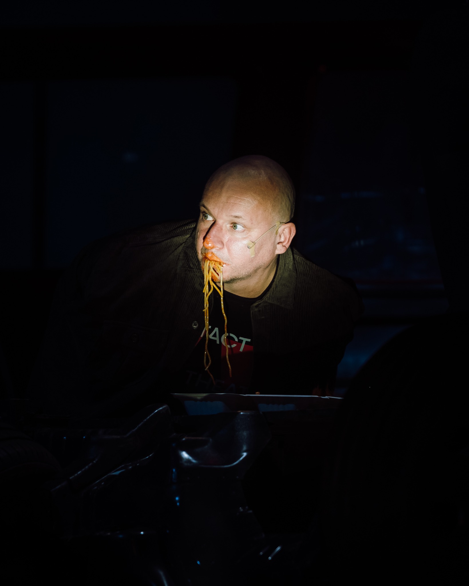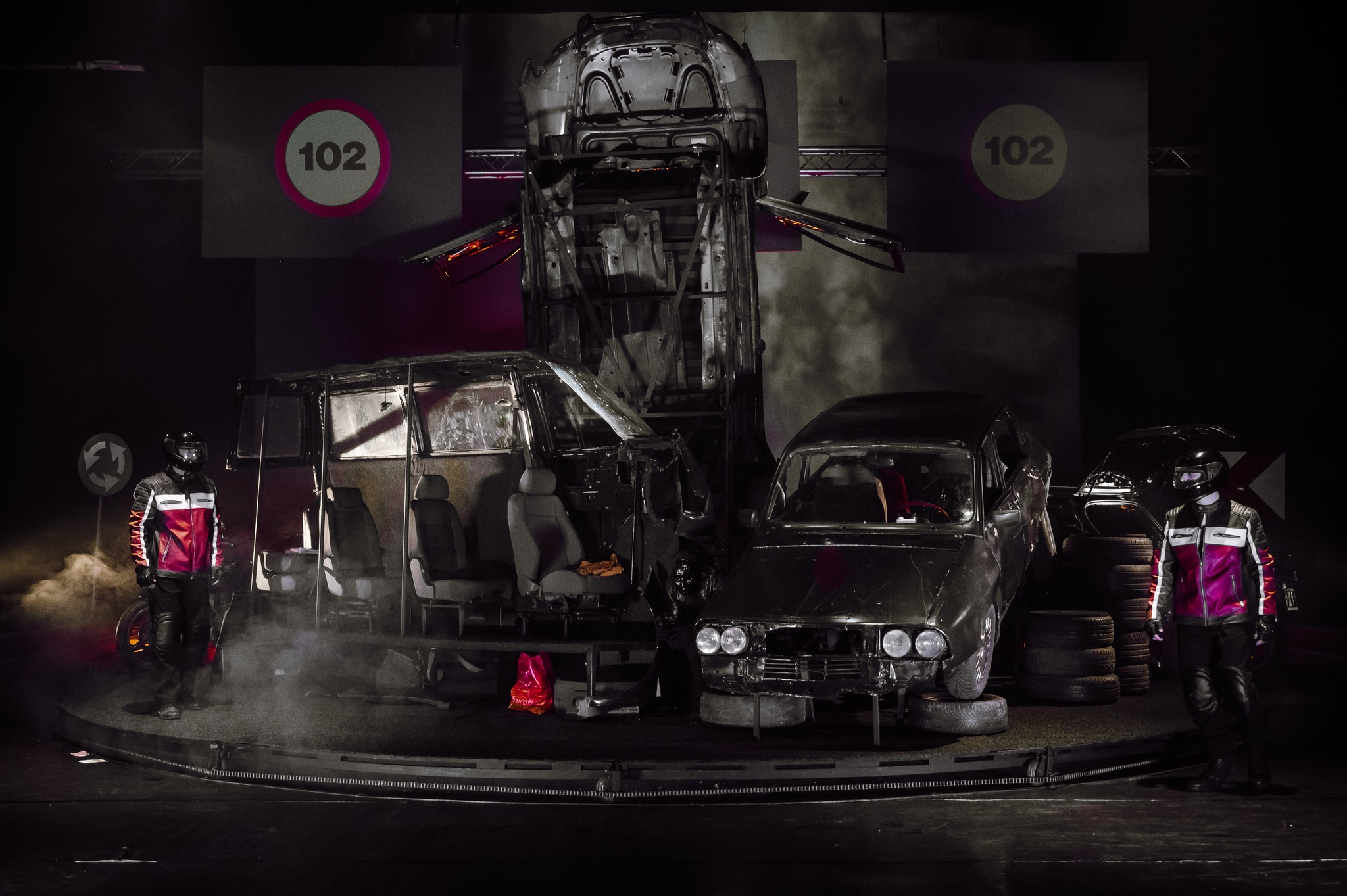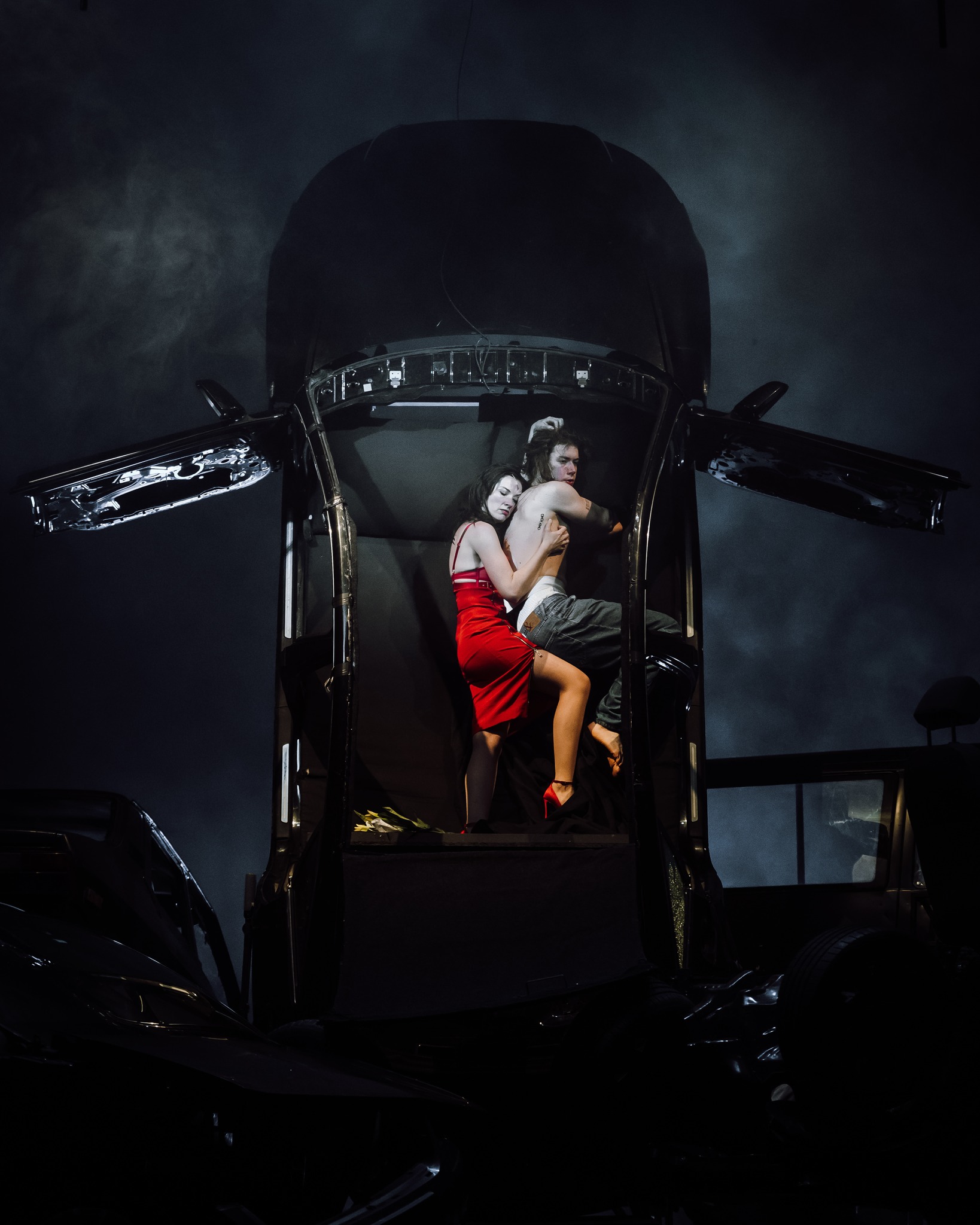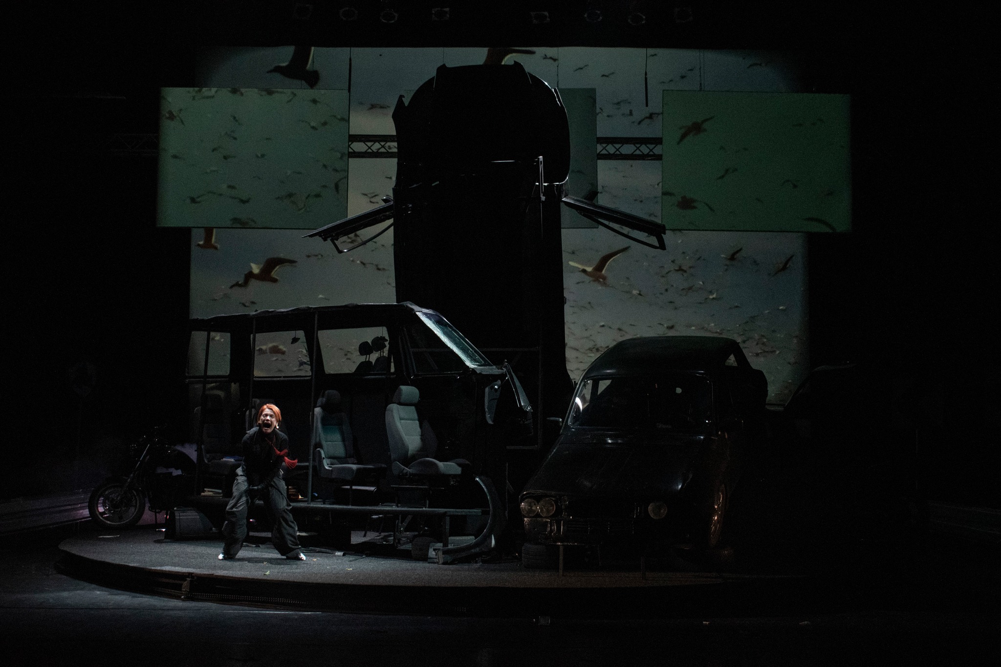 Cea din urmă agent dublu (înlocuind pentru o clipă Moartea însăși!), deja infiltrată în grupul de teatrologi ce nu mai poate analiza prezența lor în premiera acestui spectacol (!), un grup de critici, blocat în caroseria microbuzului ce urma să-i aducă la Târgu Mureș, rămas să reflecteze autoironic de departe, de pe lumea cealaltă, asupra rolului teatrului și al propriei lor meniri (Hajnal, Viki, Kata și Berci, cărora Hajnal Somody, Viktória Renczés, Bea Fülöp și Gábor Tollas le desenează cu mult umor frici plauzibile, atitudini demonstrative și raporturi de forță prin care analizează viscerele acum căscate ale lumii ce se deshide la propriu la picioarele lor, lângă caroseria umanității mici de proximitate, preocupată excesiv de siluetă, aspectul fizic, recunoașterea intelectuală și ultimul selfie cu Moartea (dar și de diurnă ori de scoaterea în afara relevanței discursului critic al vremurilor – orice asemănare cu realitatea nu e tocmai întămplătoare…) scotocind cu atenție prin măruntaiele dramatice și teatrale după esențe de postuman dincolo de ultima suflare.