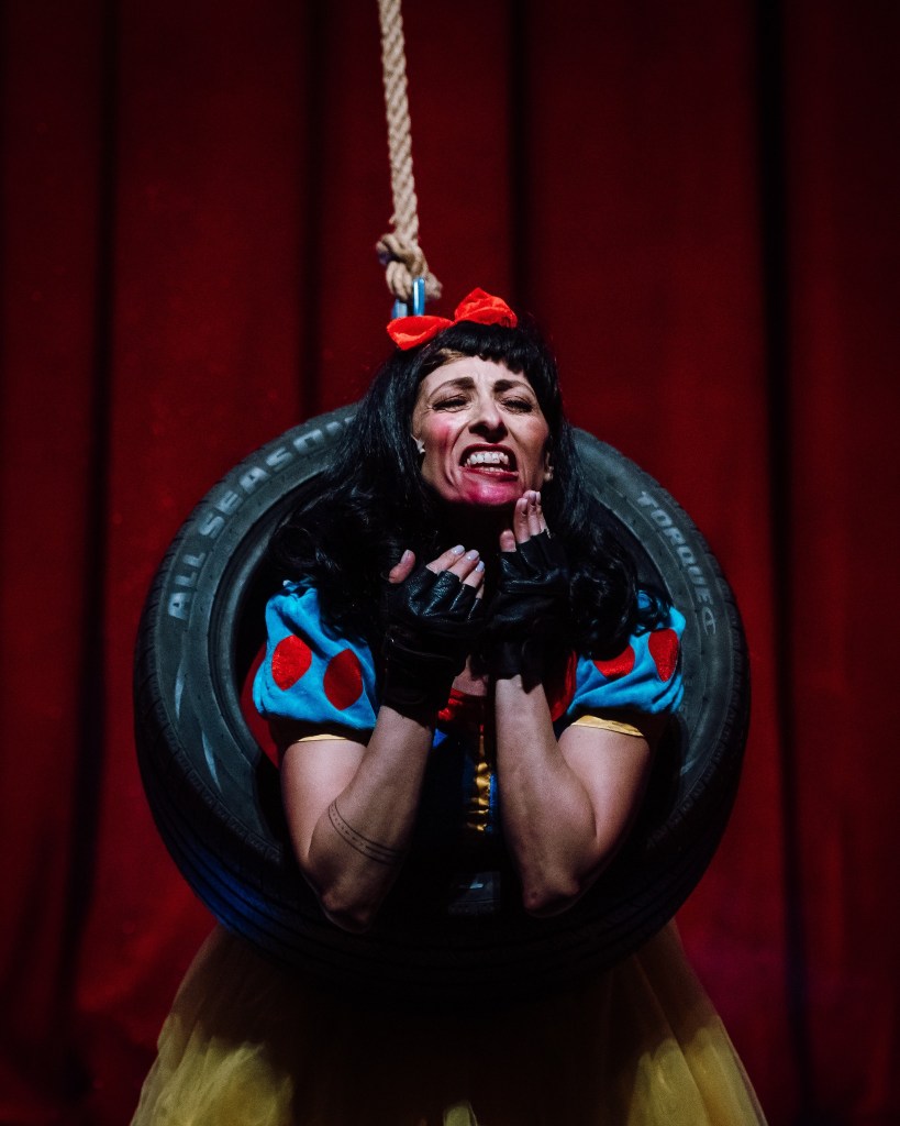 Sala de teatru. Unde ne așteaptă cu zâmbetul pe buze o actriță de ocazie la evenimente pentru copii (dar și singurul personaj azvârlit de pe carosabilul turnantei și chiar de pe scândura de joc direct în avanscenă) ajunsă în sfârșit pe o rampă importantă, fie și măcar pe buza ei (!), cu șansă reală să interpreteze rolul vieții sale scurte, deja trecută (!), legănând prologul și toate neliniștile rău prevestitoare pe roata unei realități deja dezasamblată (Kinga Benő detașată și auto-ironică, Albă-ca-Zăpada dintr-un confesional amar, singurul text externalizat de autorul dramatic și folosit ca pretext pentru referențialul ce urmează, deschizând tuturor calea spre dubla ipostază, de om și actor). Uitată ca din întâmplare dincoace de cortină cu sarcasm și baloane de petrecere la îndemână, doar-doar o încăpea pe mâna vulcanizatorului ce are să-i peticească și ei mersul circular pe turnanta muzeală (!), până s-o găsi o altă roată de rezervă… printre atâtea roți ce și-au rătăcit drumul la picioarele păsării metalice în zbor!…