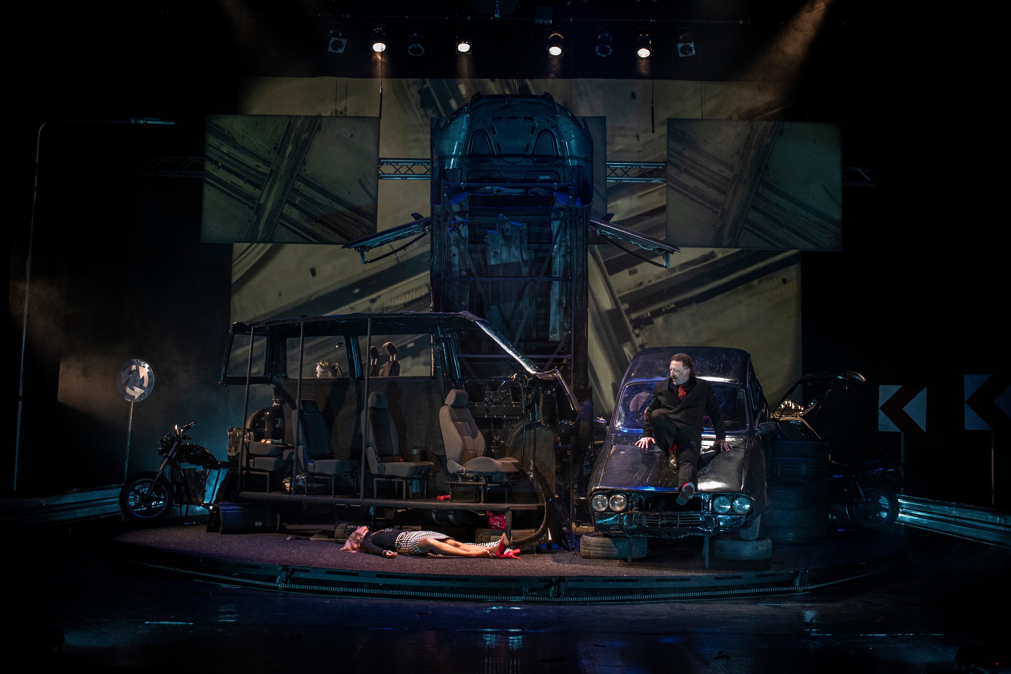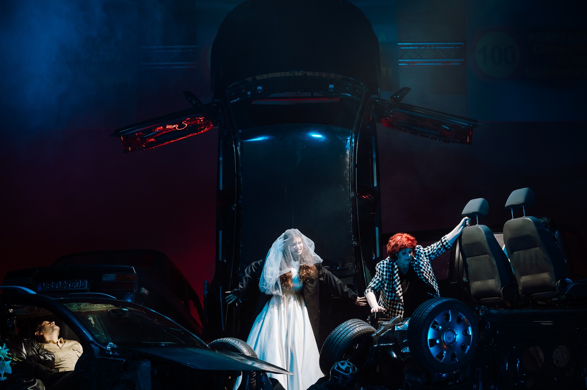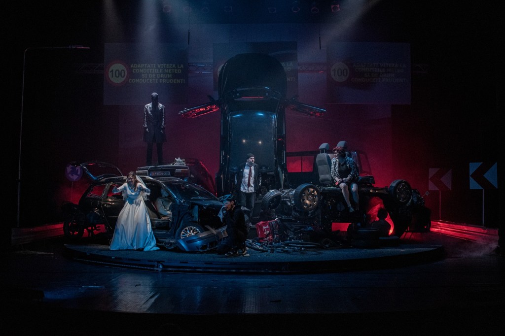 O scriitură vie, bogată și inteligentă a dramaturgului și regizorului Andrei Măjeri, care aduce scenei un spectacol provocator, ce dezvoltă ingenios dramatic cea mai importantă temă de gândire a omenirii din toate timpurile, moartea, comprimată în 15 (inițial 17) povești de trecere în revistă a vieții ce se lasă trăite și împlinite teatral alături de o echipă de creație cu care și-a mai pus în scenă frământările: scenograful Adrian Balcău, prin al cărui decor (luminat spectaculos de Samu Trucza – light design – și prelungit inteligent de Andrei Cozlac – video design -, care-i adâncesc dimensiunile și îi augmentează emoționalul) coregrafa Andrea Gavriliu mișcă fără încetare trupurile recompuse ce caută să se smulgă din inerția șocului ce le-a paralizat pentru o clipă (sperând poate să recapete chiar și prin neastâmpăr suflul vieții) în zgomotele metalice ale ambuteiajului în care au rămas încremenite după impact, ce-și stinge ultimele alarme în solemnități de capelă (din nou la înălțime Adrian Piciorea, sound design). Lăsând loc Morții să caute printre resturile de umanitate zorii drumului unei alte dimineți ce se va pierde în negură îndoliind inevitabil cerul („Napom, napom” / „Soarele meu”, tema muzicală leit-motiv cu care Ferenc Tompa își însoțește pe parcursul spectacolului crinii pentru fiecare (!), dezvoltată de Katalin Incze G. – consultant muzical – în polifonia de final ce încununează apusul). Ceea ce face ca subtemele abordate (în cheie astfel dinadins peiorativă) ale umanului efemer ce preocupă deopotrivă artiștii și marii gânditori ai vremurilor noastre (avuție, faimă, putere, nevoie de validare, concurență, invidie, gelozie, corupție, aroganță, etc.) să devină și mai pregnant, prin personajele ce le pun în lumină, zgomote inutile ce ne distrag atenția de la esență și iubire, explorate la rândul lor într-un ideatic identitar proiectat prin căutarea și descoperirea de sine (chiar și sau mai ales a propriei sexualități, care răzbate din fiecare poveste) într-un contemporan alert, hâd și confuz, ce ne refuză recunoașterea și înăbușă adesea exprimarea eului, unde fiecare pare să se fi rătăcit demult în propria neacceptare și în spatele măștilor pe care este nevoit să le poarte în căutarea nordului. Până în ziua în care busola de pe bord se sparge.