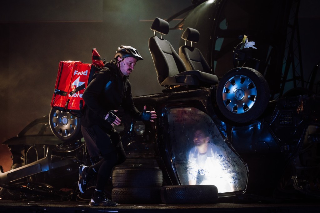 Nu se ciocnesc doar destinele acestor personaje, ci și realitatea scenei de realitatea fiecăruia dintre ele și, împreună, de realitatea noastră culturală și socială (cu importante referințe locale ce aduc spectatorului mureșean plauzibil și recognoscibil), minunat explorate prin intermediul unui delivery boy, victimă și martor activ (de câtă baterie i-a mai rămas la telefon!) la fatidicul accident în urma căruia s-a contabilizat daună totală. Excelent Balázs Varga în rolul rezonerului Szőke Gusztáv Jr., o apariție pitorească ce fixează măruntaiele srilankezului sau pakistanezului livrator din anticipatele buletine de știri senzaționale TV (!) sus în deal, la Glodeni, de unde a coborât pe bicicletă cu rucsacul cubic doldora de pilde, bancuri și empatii conjuncturale pentru a destinde ori de câte ori e nevoie atmosfera încordată a scenelor cu miros de moarte.