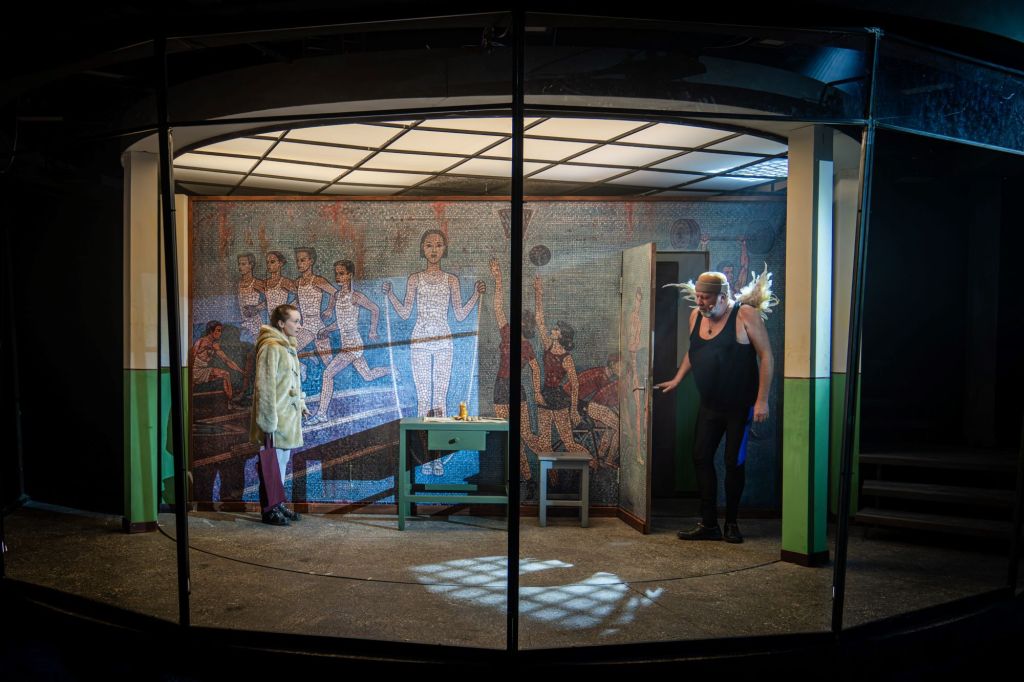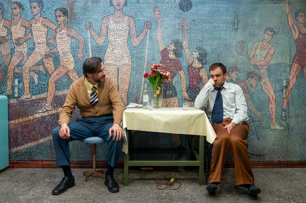 De sub dunga de vopsea (pe vremuri se folosea bandă de casetofon sau magnetofon spre a se trage linia dreaptă, așa am și privit-o, cu ritmuri recunoscute întipărite acolo pentru totdeauna!) care delimitează brâul verde de varul peretelui pe holurile clădirilor comuniste (sau chiar în locuințe, unde mobilele tronează în sufragerie protejate cu huse textile iar mesele de bucătărie cu mușama de vinilin), ale căror ziduri exterioare redau adesea, prin mozaicuri colorate, activități de muncă și recreație (nice touch!) la care sunt invitați mai ales tinerele vlăstare ale partidului, se ridică adesea interioare uluitoare, doldora (ca și imaginile proiectate deasupra zidului) de lumi și personaje reale alternate cu unele imaginare, aproape posibile, unde Afrim își folosește din plin inventivitatea, trăgându-le fiecăruia și tușe groase de autohton și local, care asigură umorul și nostalgia vremurilor și temperează la timp tonul trist sau tragic al poveștilor prezentate. Undeva dincolo de suprafața rămasă noroioasă și confuză (unde vom rămâne noi) a unui univers recognoscibil și îngălat, proaspăt ieșit din opinci și strămutat într-un urban industrial sărăcăcios ce și-a câștigat cu greu bruma de civilizație pe care și-a permis-o și de care s-a agățat cu toată forța sperând că are să vie ziua unui mai bine.