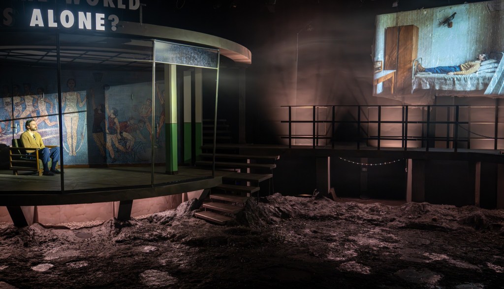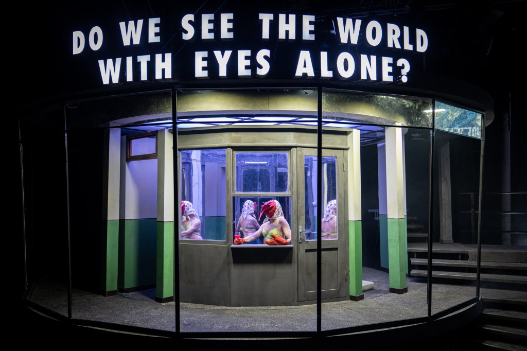 Pe scândura unei scene lacustre, pentru că scenografa Oana Micu a avut grijă să ne suspende în ideea năstrușnică a lui Radu Afrim undeva într-un extraspațiu supraacvatic (de unde dau uluitor drumul la suprarealisme, excelent ajutați de Andrei Botnaru și Andrei Cozlac – video design și video mapping – și Nichita Teodorescu – light design -), aproape în aer, într-o stare nu se știe prea bine dacă lichidă, solidă sau gazoasă (!), într-un soi de levitație care nu are nicio legătură cu alt gravitațional decât cel dramatic, la rândul lui de consistență eterică (heleșteul, prezent doar acustic în fundul scenei și accesibil vizual doar celor ce-l traversează, e imaginat undeva jos, sub nivelul de la care privesc spectatorii). O invitație la o existență metaforică lacustră, la o plutire aproape palpabilă pe aburii unor interioare, exterioare și respirații de demult ce se ridică (cu acvariu cu tot, foarte interesant folosit și compartimentat spațiul ridicat pe turnantă) deasupra trupurilor înghețate de vremuri și conservate întocmai (domiciliar, vestimentar, preocupațional, comportamental) printre rădăcini de istorie legate și înecate împreună.