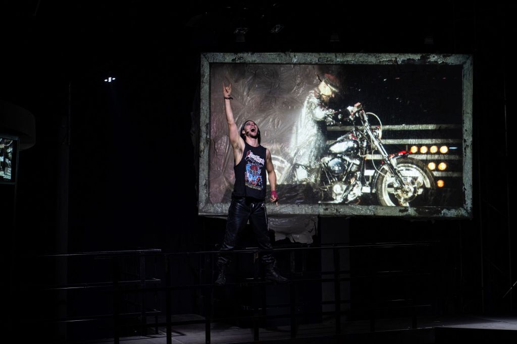La mijloc rămâne suspendat un personaj de coloratură, faster than a bullet (cu Painkilleru’ asortat!), cu care Radu Afrim alege să deschidă surprinzător cea de-a doua parte a spectacolului, un rocker răzvrătit din județul Botoșani, fan pârlit Judas Priest (după ce s-a lăsat de „plagiatorii” de la Maiden, Hallowed be Thy name!…) căruia Răzvan Conțu îi bagă pletele, țintele, flăcările, metalele grele și furia încă neexprimată în povestea cu care întregește pasionant peisajul rock (adus pentru o clipă în formulă completă la scenă!) într-o lume tristă, debusolată și descompusă care încă își mai caută noimă și valori prin mlaștinile României profunde și pe fundul Orașului Scufundat din care se străduiește cu orice prilej să evadeze.