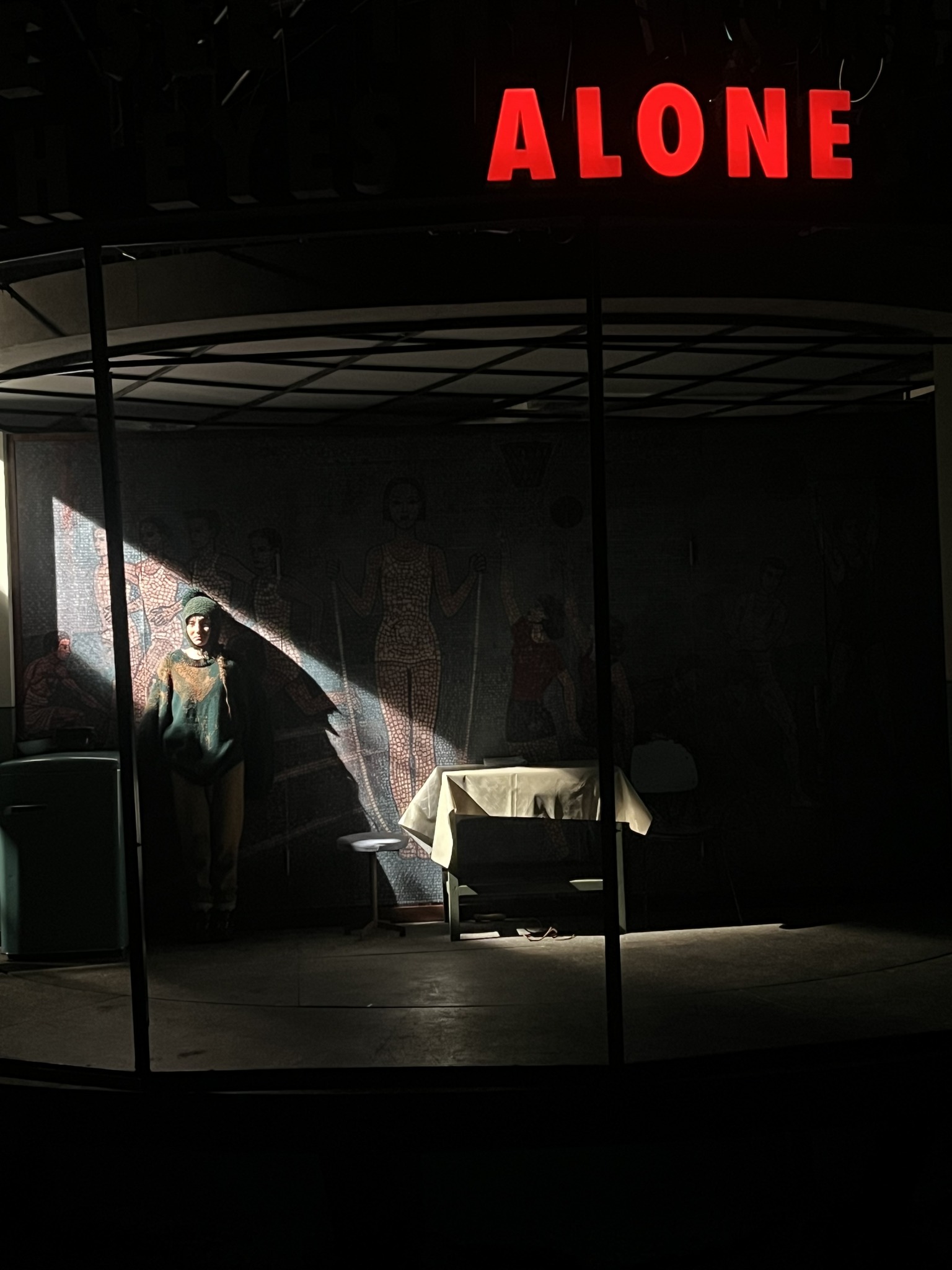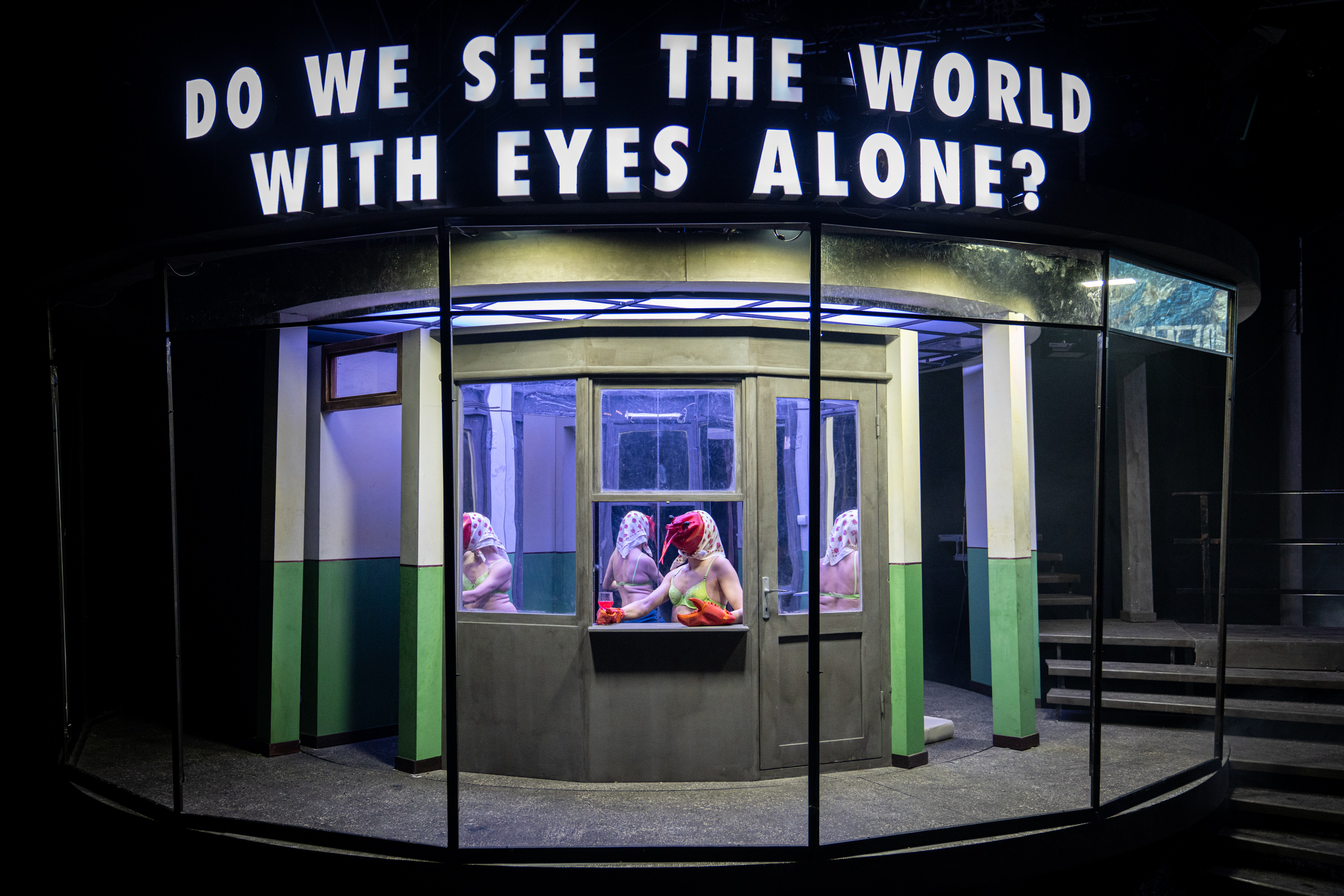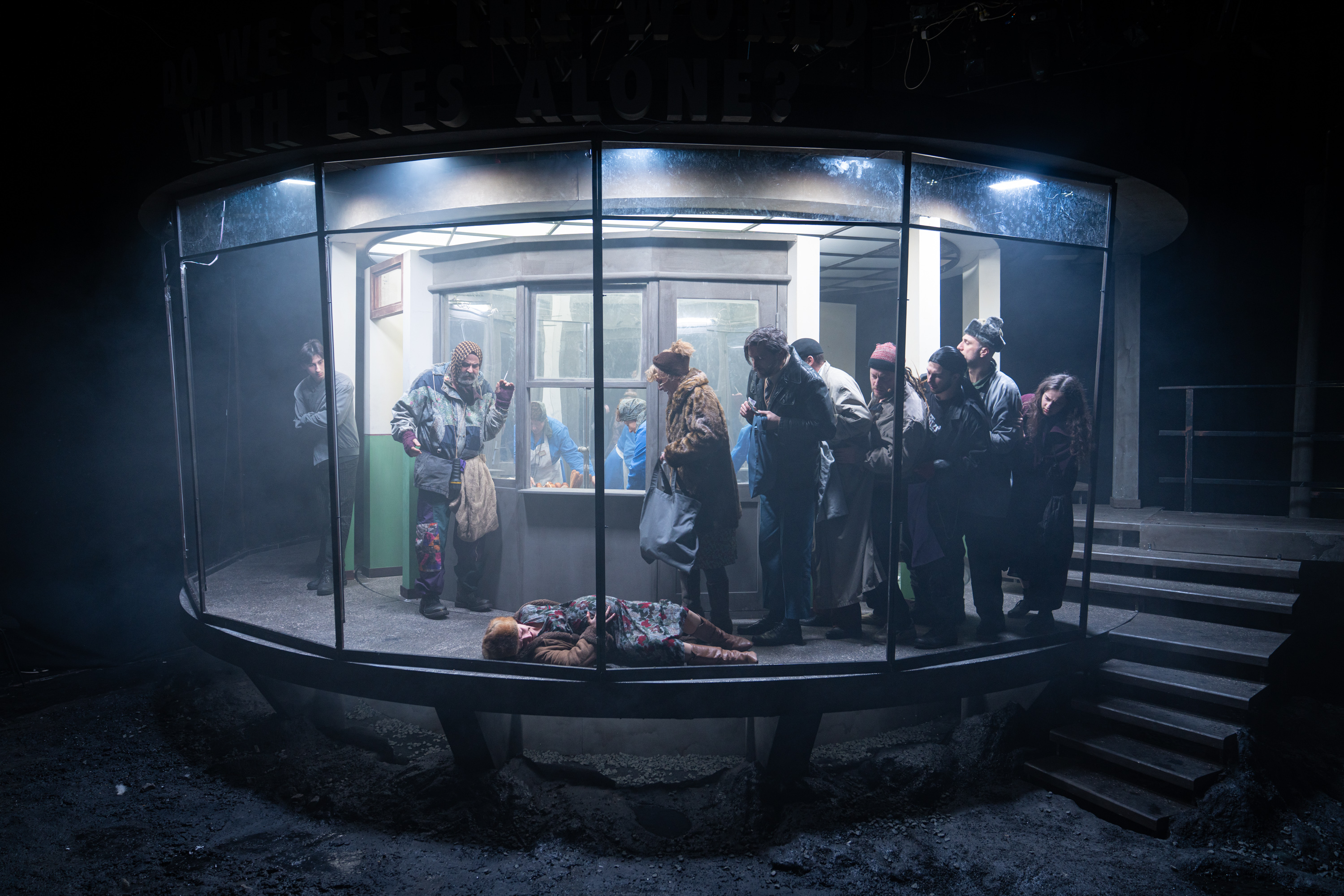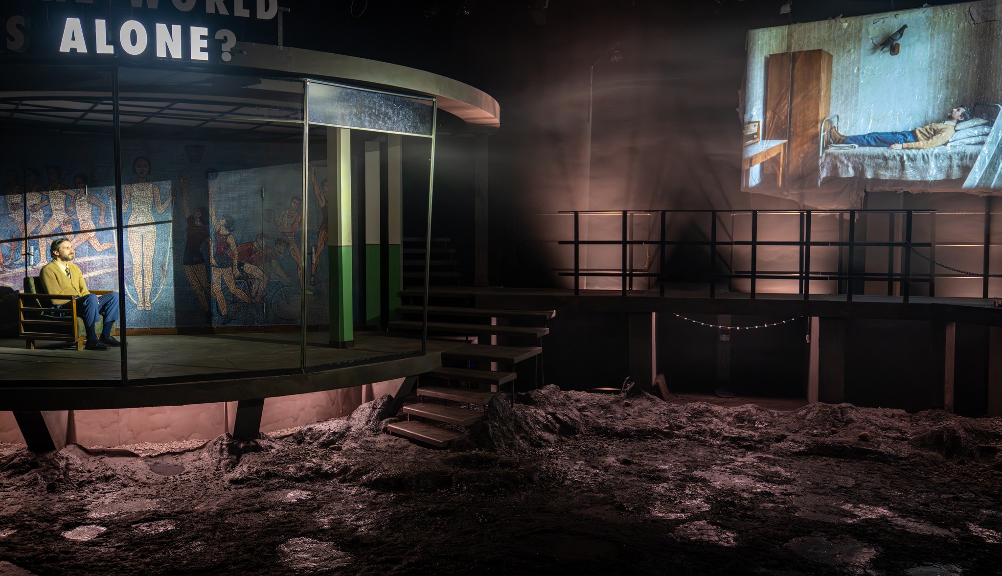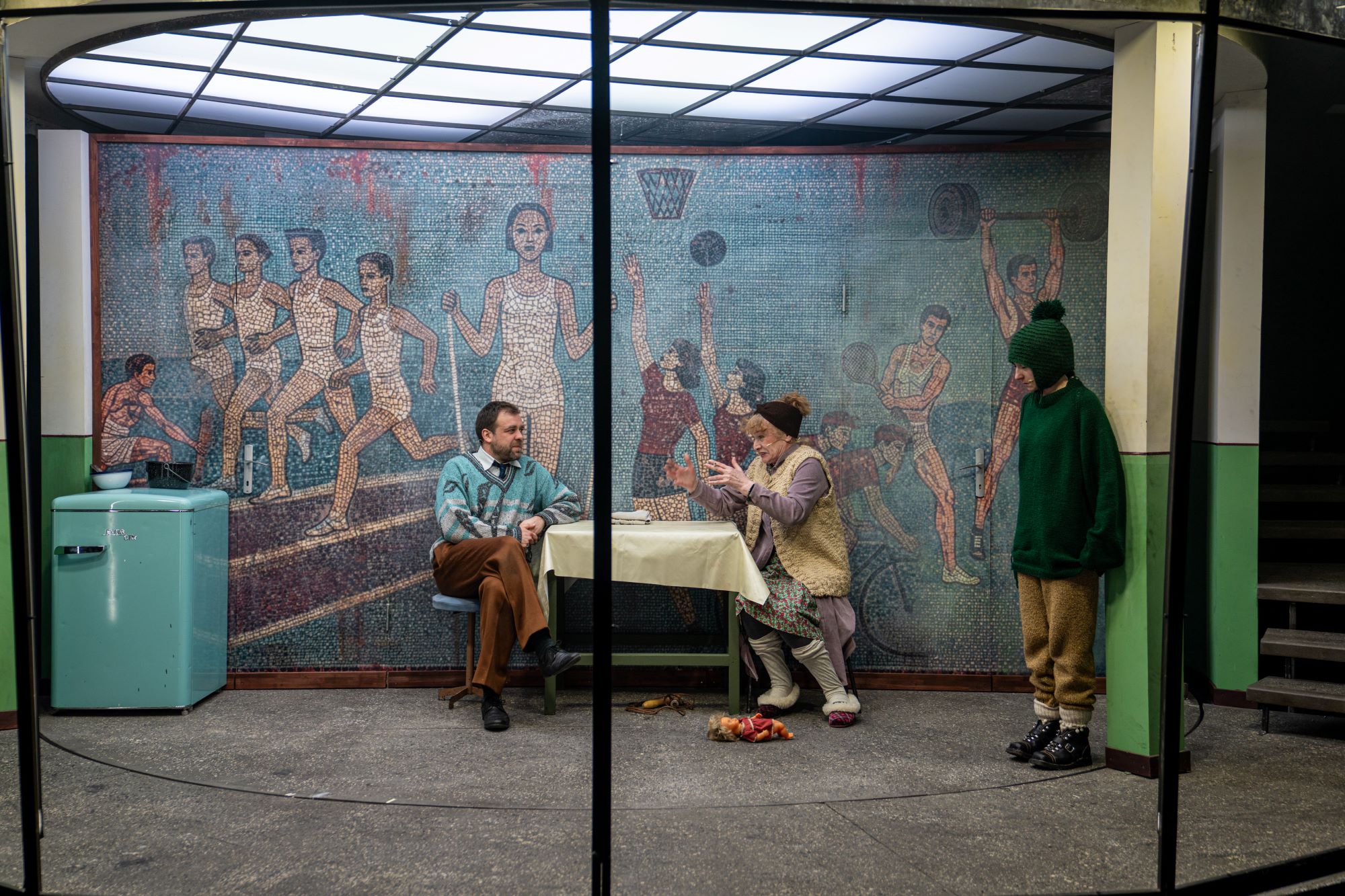 De sub dunga de vopsea (pe vremuri se folosea bandă de casetofon sau magnetofon spre a se trage linia dreaptă, așa am și privit-o, cu ritmuri recunoscute întipărite acolo pentru totdeauna!) care delimitează brâul verde de varul peretelui pe holurile clădirilor comuniste (sau chiar în locuințe, unde mobilele tronează în sufragerie protejate cu huse textile iar mesele de bucătărie cu mușama de vinilin), ale căror ziduri exterioare redau adesea, prin mozaicuri colorate, activități de muncă și recreație (nice touch!) la care sunt invitați mai ales tinerele vlăstare ale partidului, se ridică adesea interioare uluitoare, doldora (ca și imaginile proiectate deasupra zidului) de lumi și personaje reale alternate cu unele imaginare, aproape posibile, unde Afrim își folosește din plin inventivitatea, trăgându-le fiecăruia și tușe groase de autohton și local, care asigură umorul și nostalgia vremurilor și temperează la timp tonul trist sau tragic al poveștilor prezentate. Undeva dincolo de suprafața rămasă noroioasă și confuză (unde vom rămâne noi) a unui univers recognoscibil și îngălat, proaspăt ieșit din opinci și strămutat într-un urban industrial sărăcăcios ce și-a câștigat cu greu bruma de civilizație pe care și-a permis-o și de care s-a agățat cu toată forța sperând că are să vie ziua unui mai bine.