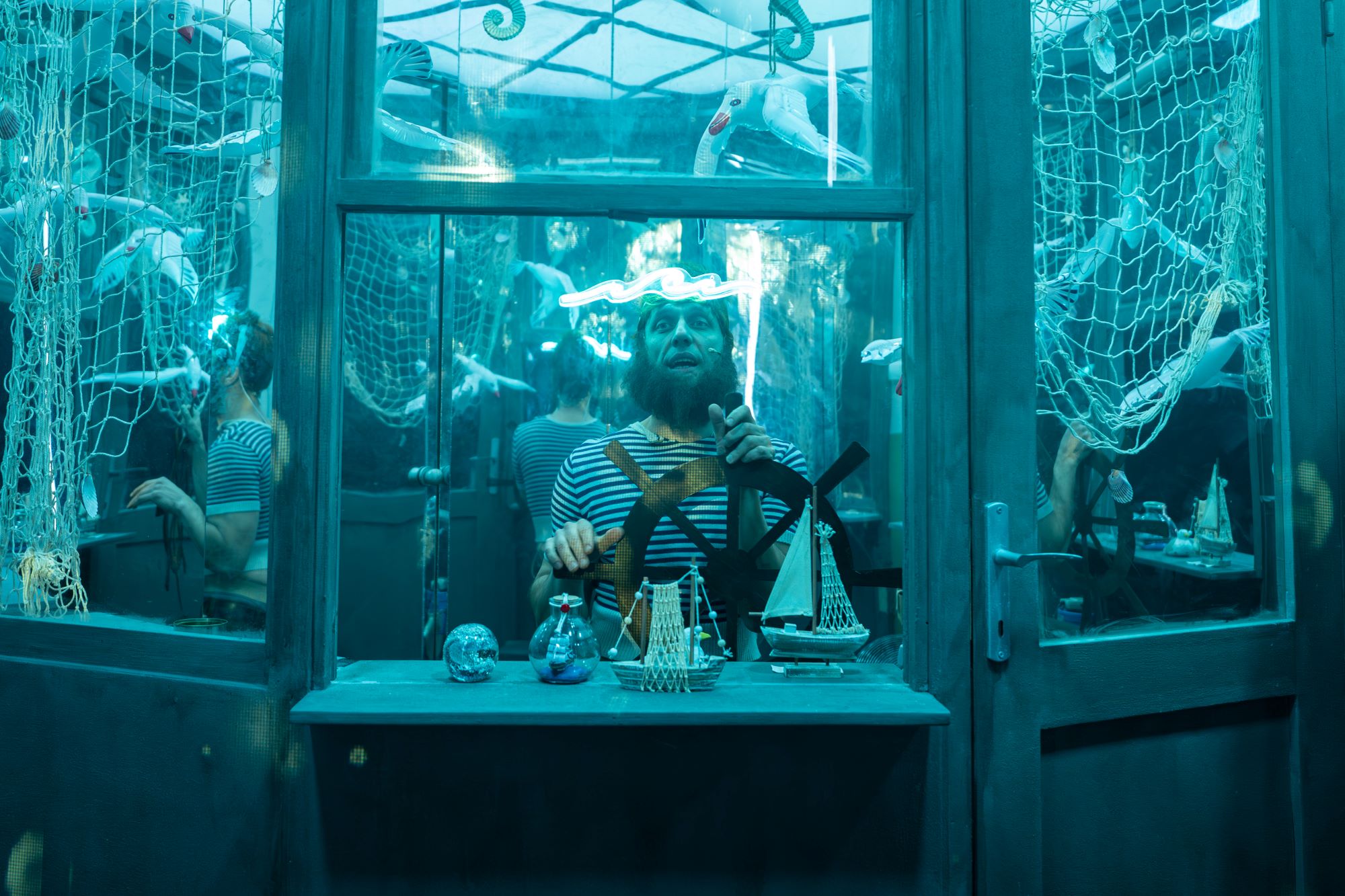 Pe care vânzătorul de suveniruri (efervescentul Horia Veriveș, superbă pată de culoare!) încă mai caută să le mistifice și să-și umple buzunarele diminuându-le importanța cu bric-à-brac-ul lui cu tematică subacvatică, unde încearcă să-și vândă marfa proastă (și superstițiile!) păzită de poseidoni cu tridenți luminoși și alte kitschuri sclipicioase din plastic, prespapier și perle false învelite în celofan pe care lumea nu le-ar primi nici pe degeaba (!). Sau sub amenințarea cu eterna singurătate, oricum am privi-o.