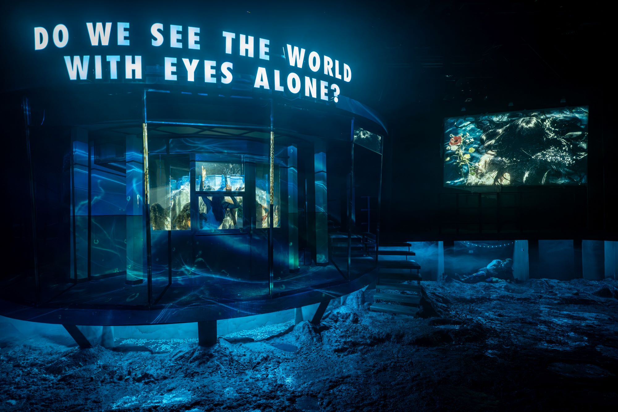 Pe scândura unei scene lacustre, pentru că scenografa Oana Micu a avut grijă să ne suspende în ideea năstrușnică a lui Radu Afrim undeva într-un extraspațiu supraacvatic (de unde dau uluitor drumul la suprarealisme, excelent ajutați de Andrei Botnaru și Andrei Cozlac – video design și video mapping – și Nichita Teodorescu – light design -), aproape în aer, într-o stare nu se știe prea bine dacă lichidă, solidă sau gazoasă (!), într-un soi de levitație care nu are nicio legătură cu alt gravitațional decât cel dramatic, la rândul lui de consistență eterică (heleșteul, prezent doar acustic în fundul scenei și accesibil vizual doar celor ce-l traversează, e imaginat undeva jos, sub nivelul de la care privesc spectatorii). O invitație la o existență metaforică lacustră, la o plutire aproape palpabilă pe aburii unor interioare, exterioare și respirații de demult ce se ridică (cu acvariu cu tot, foarte interesant folosit și compartimentat spațiul ridicat pe turnantă) deasupra trupurilor înghețate de vremuri și conservate întocmai (domiciliar, vestimentar, preocupațional, comportamental) printre rădăcini de istorie legate și înecate împreună.