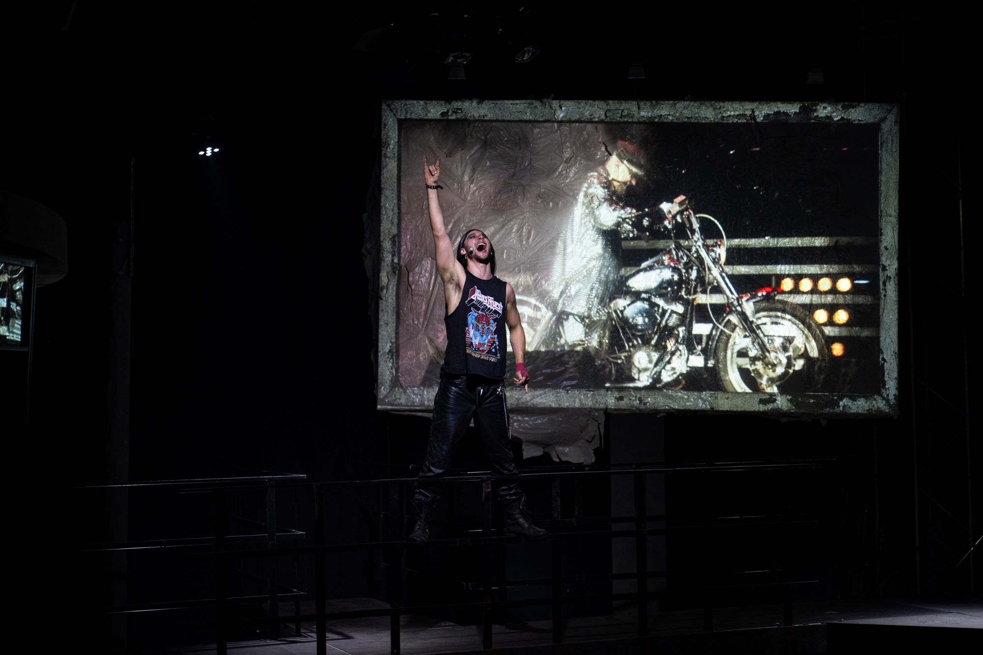 La mijloc rămâne suspendat un personaj de coloratură, faster than a bullet (cu Painkilleru’ asortat!), cu care Radu Afrim alege să deschidă surprinzător cea de-a doua parte a spectacolului, un rocker răzvrătit din județul Botoșani, fan pârlit Judas Priest (după ce s-a lăsat de „plagiatorii” de la Maiden, Hallowed be Thy name!…) căruia Răzvan Conțu îi bagă pletele, țintele, flăcările, metalele grele și furia încă neexprimată în povestea cu care întregește pasionant peisajul rock (adus pentru o clipă în formulă completă la scenă!) într-o lume tristă, debusolată și descompusă care încă își mai caută noimă și valori prin mlaștinile României profunde și pe fundul Orașului Scufundat din care se străduiește cu orice prilej să evadeze.